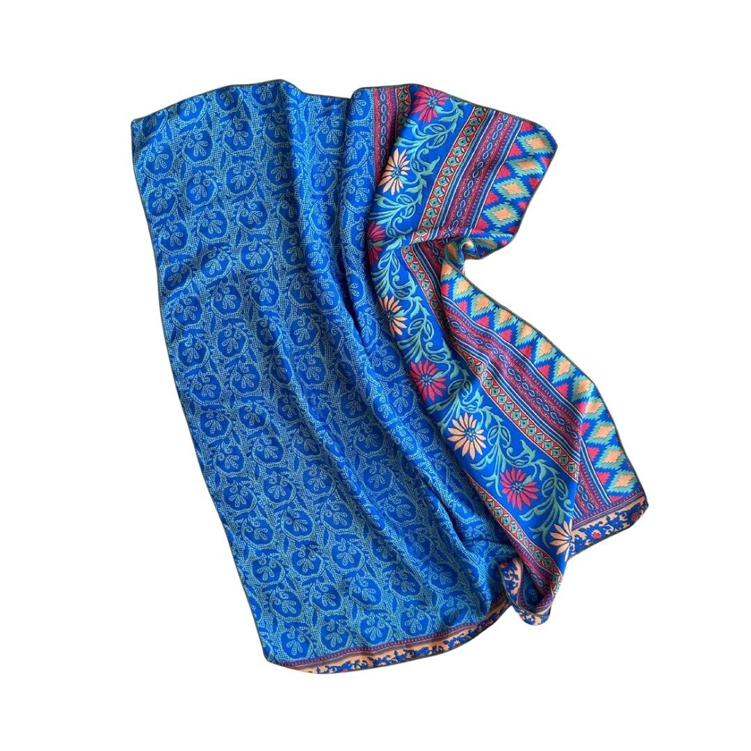 こちらのスカーフは、実際にインドの女性たちにまとわれていたサリーを再利用して仕立てています。