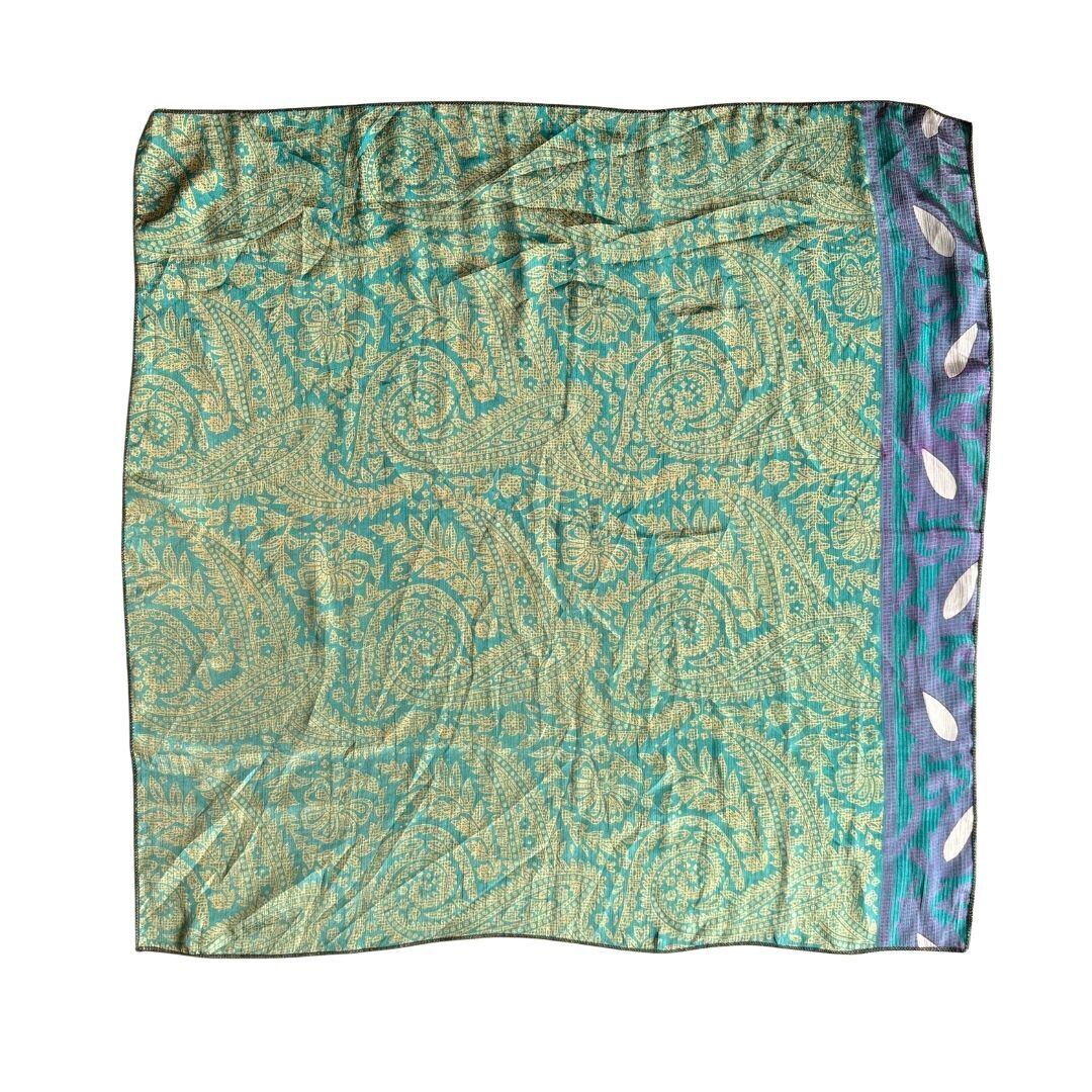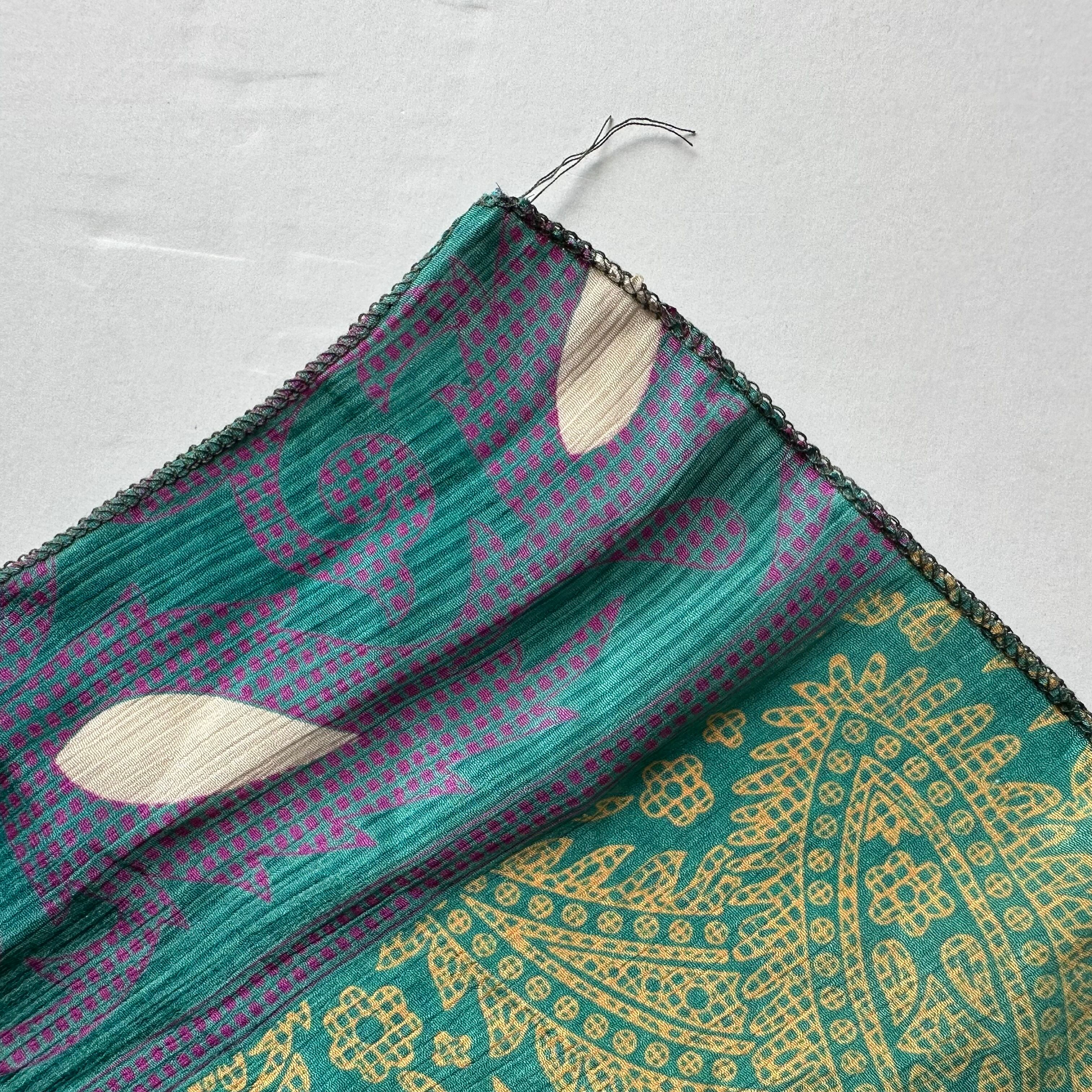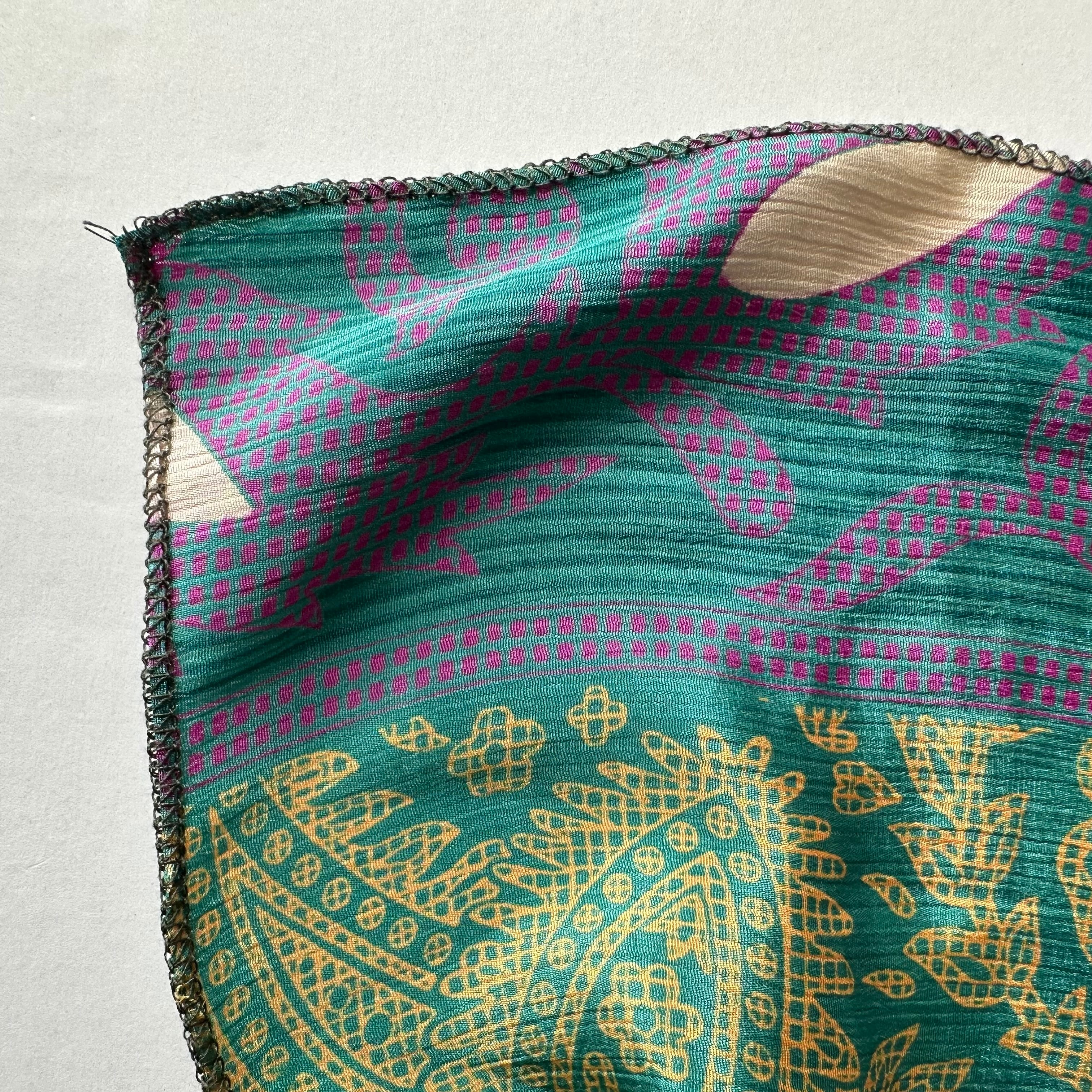 こちらのスカーフは、実際にインドの女性たちにまとわれていたサリーを再利用して仕立てています。