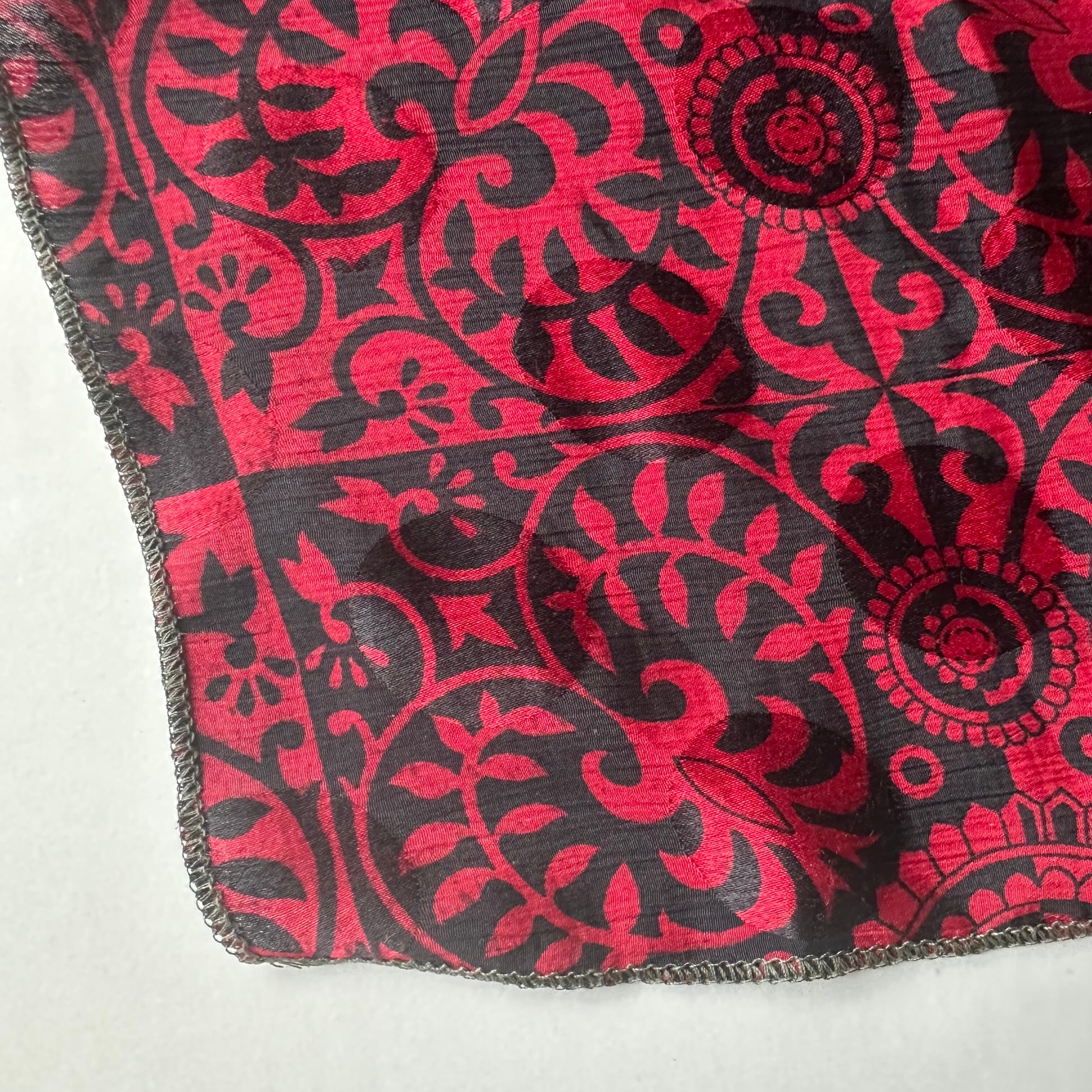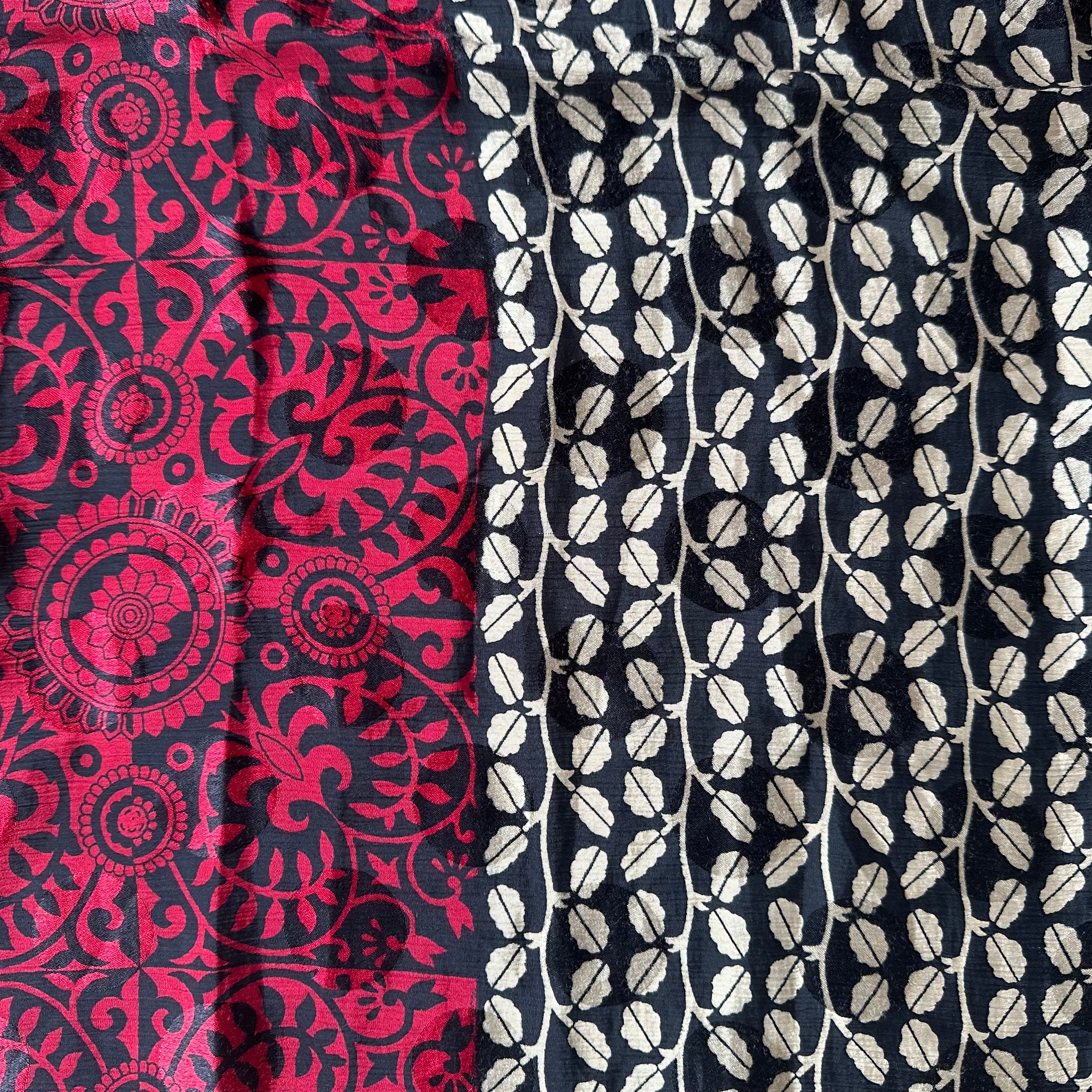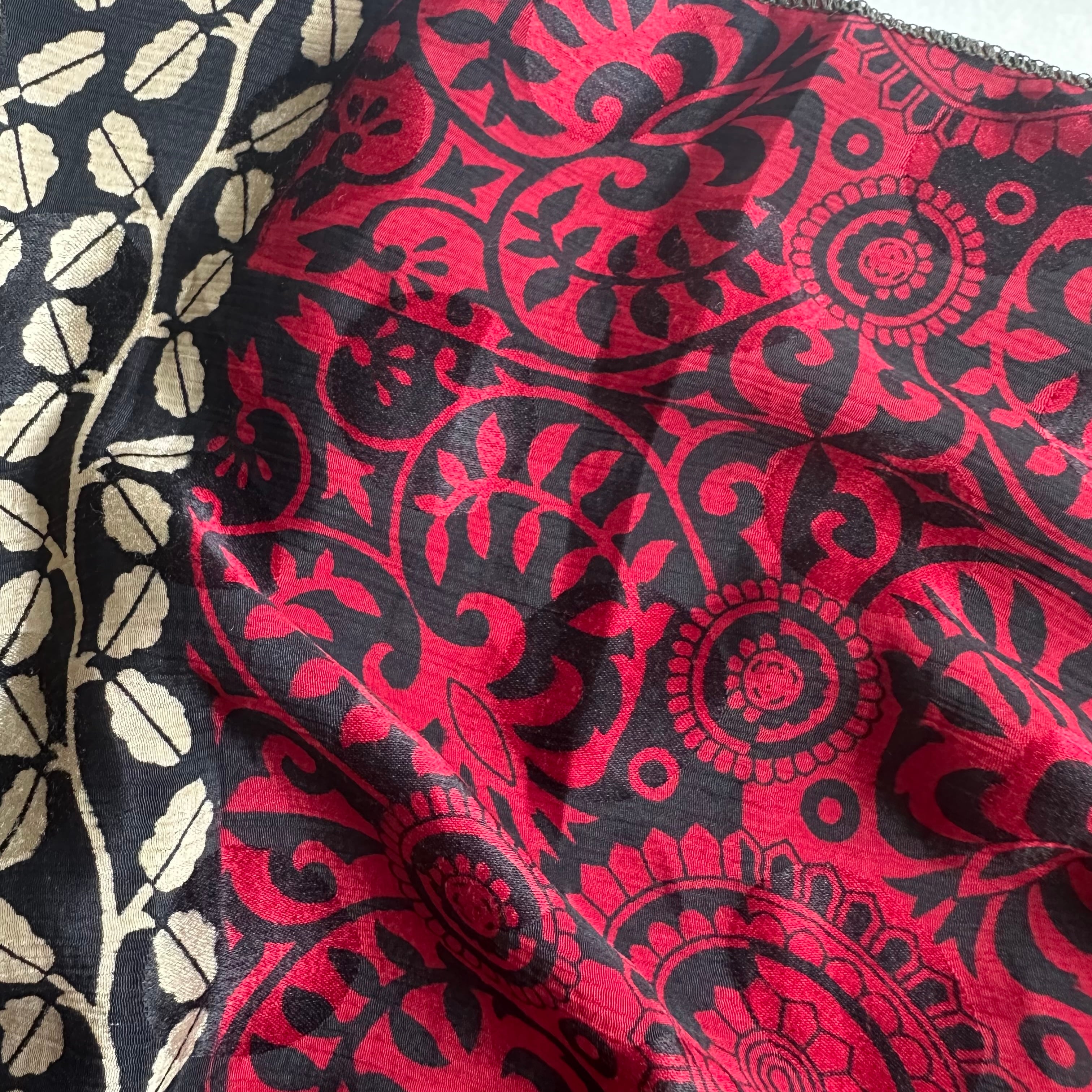こちらのスカーフは、実際にインドの女性たちにまとわれていたサリーを再利用して仕立てています。