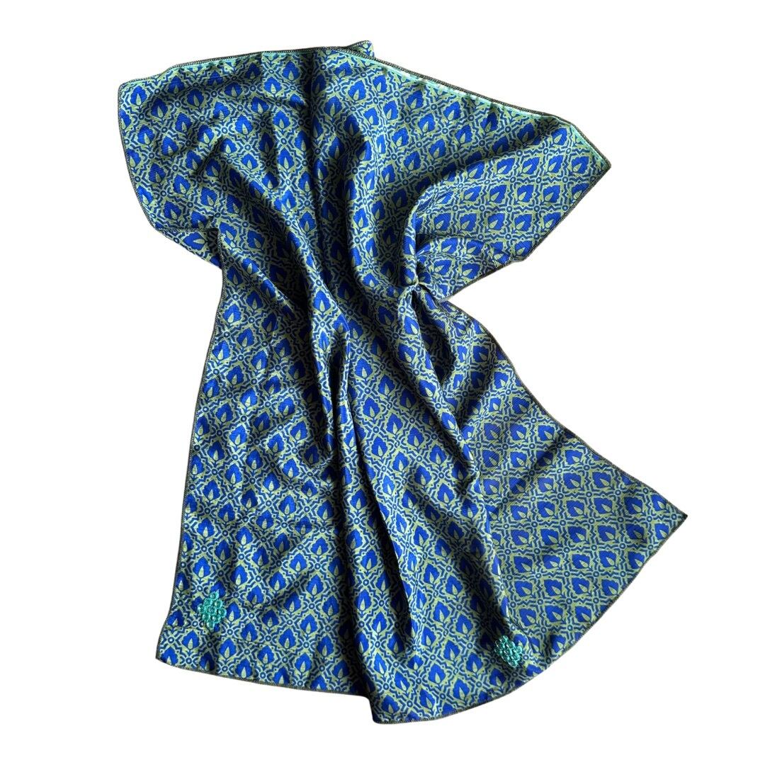 こちらのスカーフは、実際にインドの女性たちにまとわれていたサリーを再利用して仕立てています。