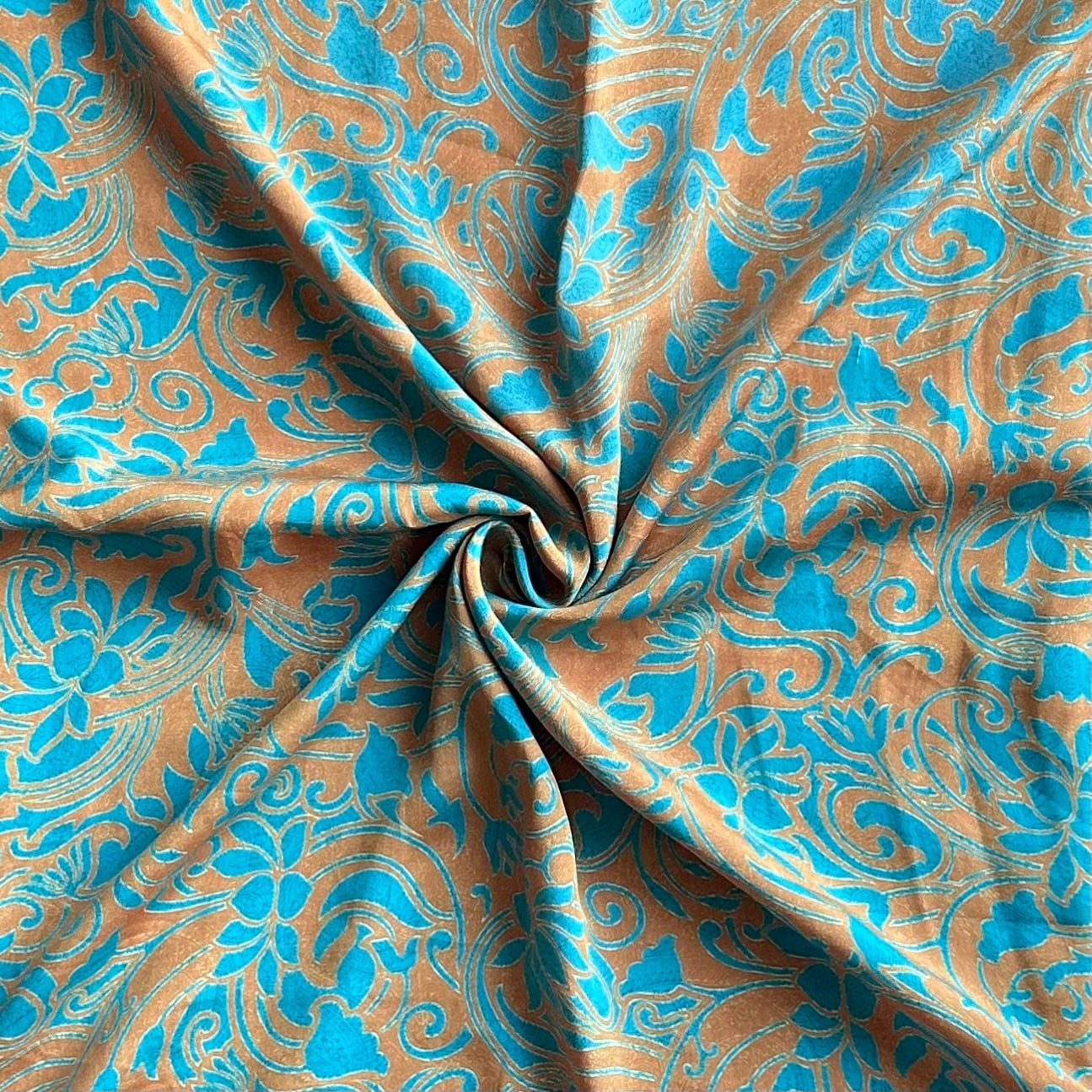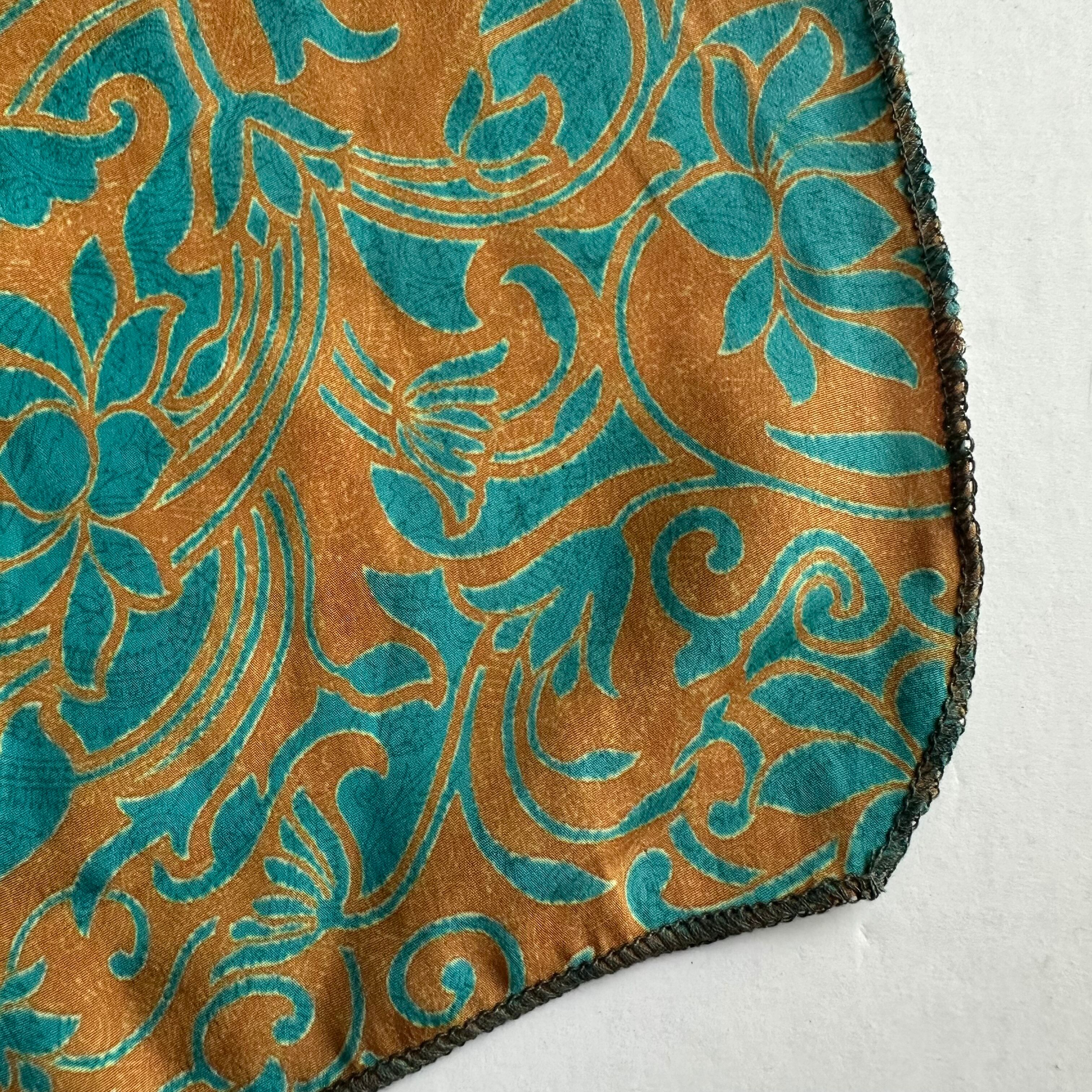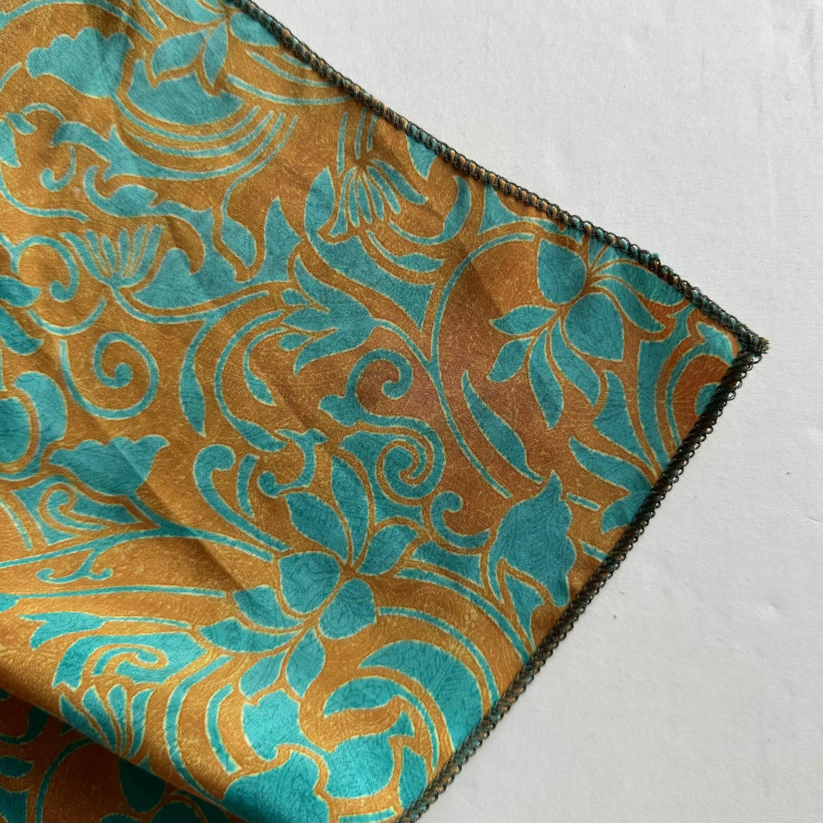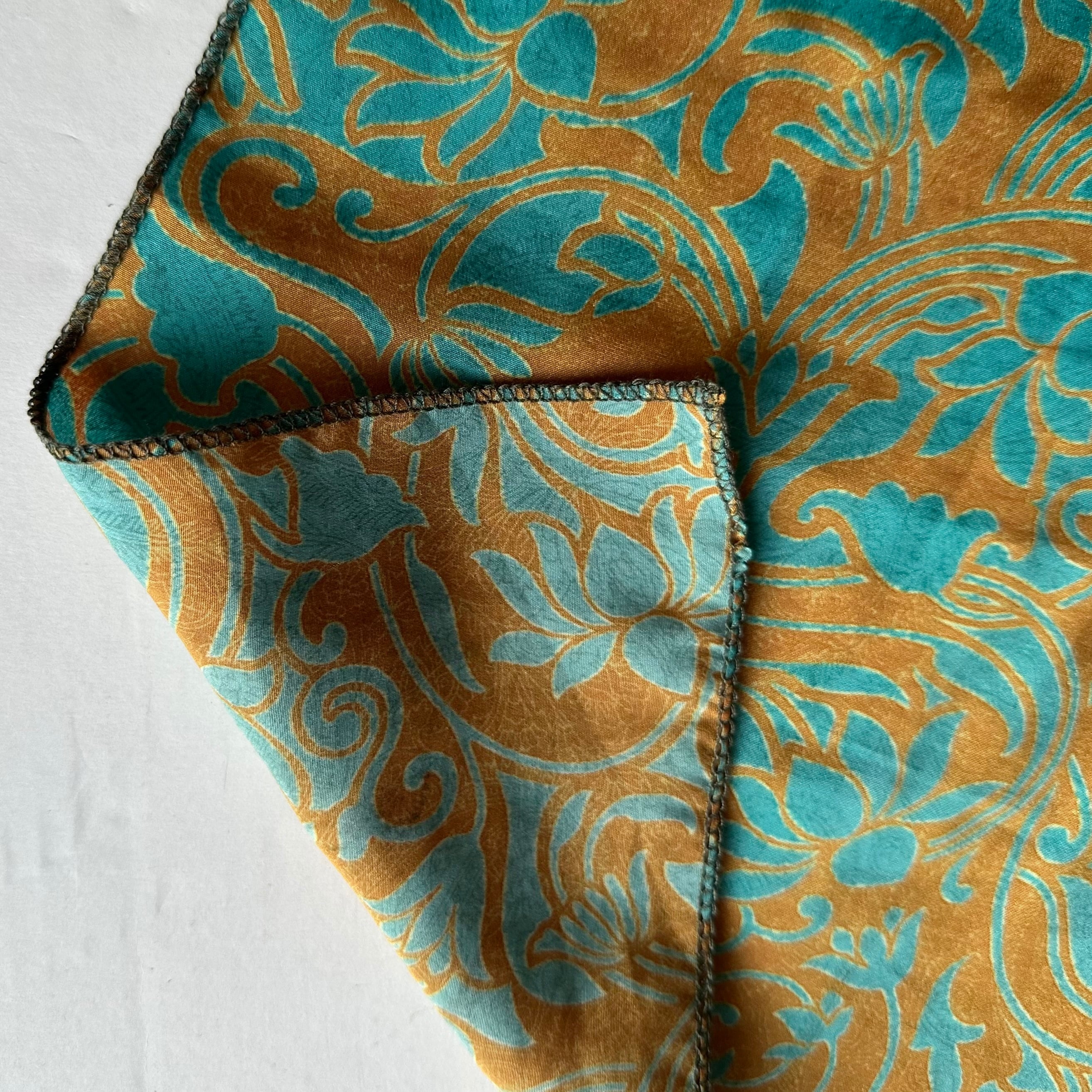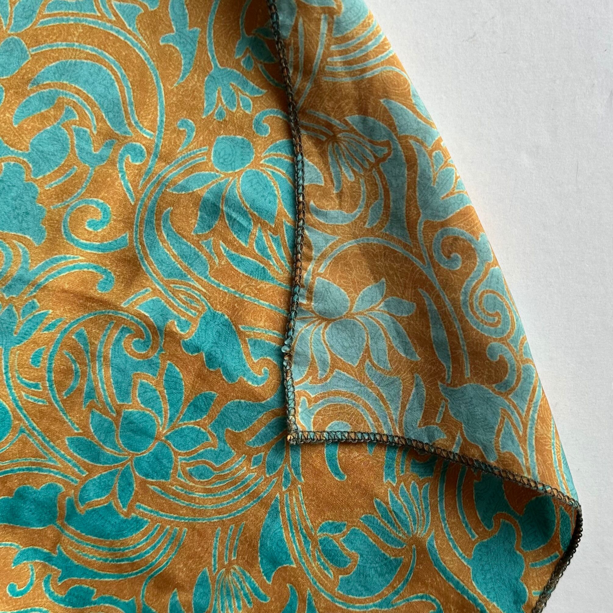 こちらのスカーフは、実際にインドの女性たちにまとわれていたサリーを再利用して仕立てています。