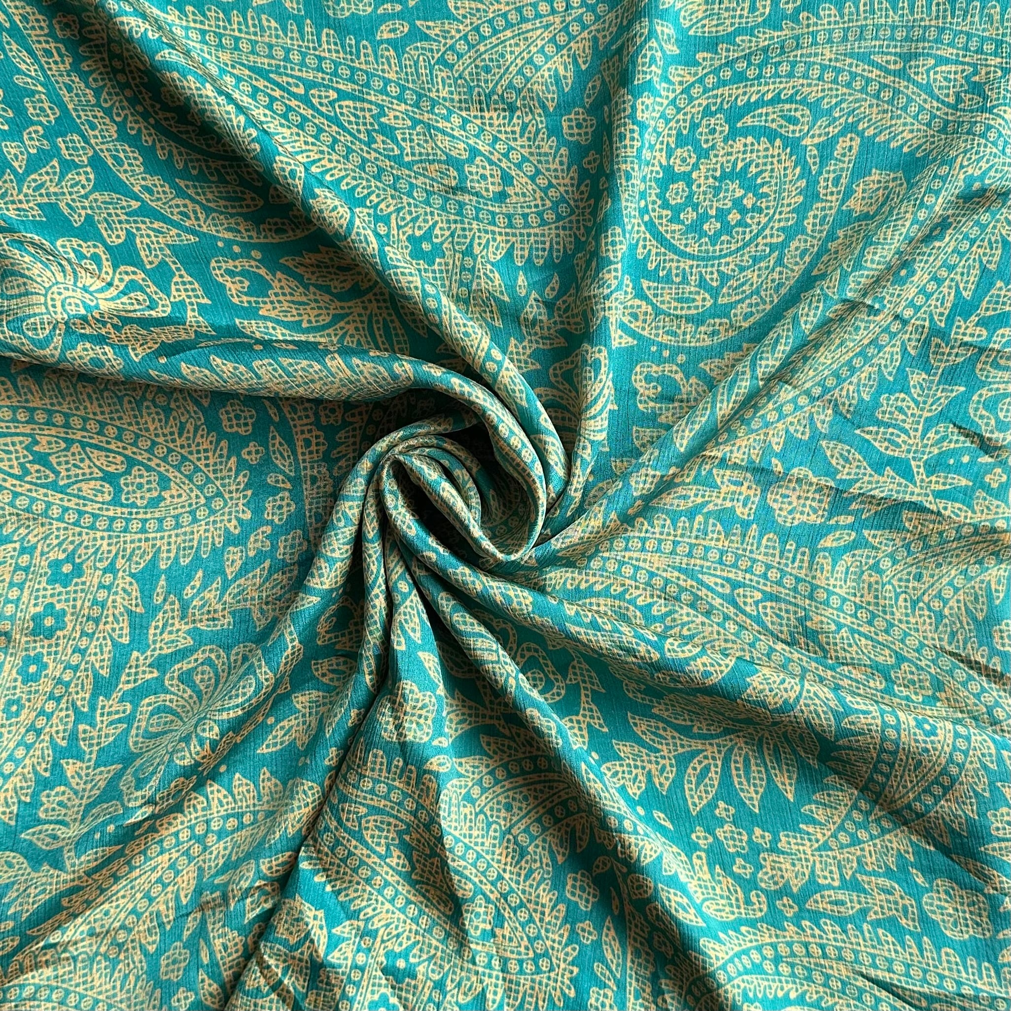 こちらのスカーフは、実際にインドの女性たちにまとわれていたサリーを再利用して仕立てています。