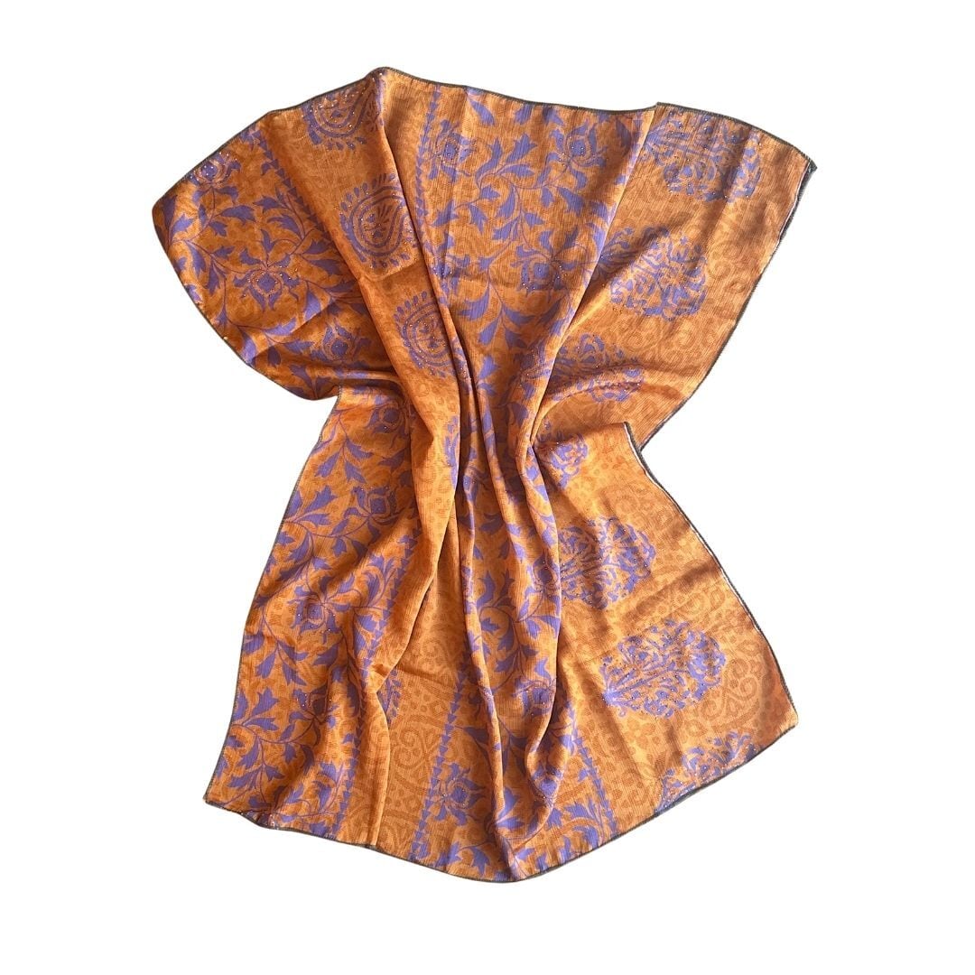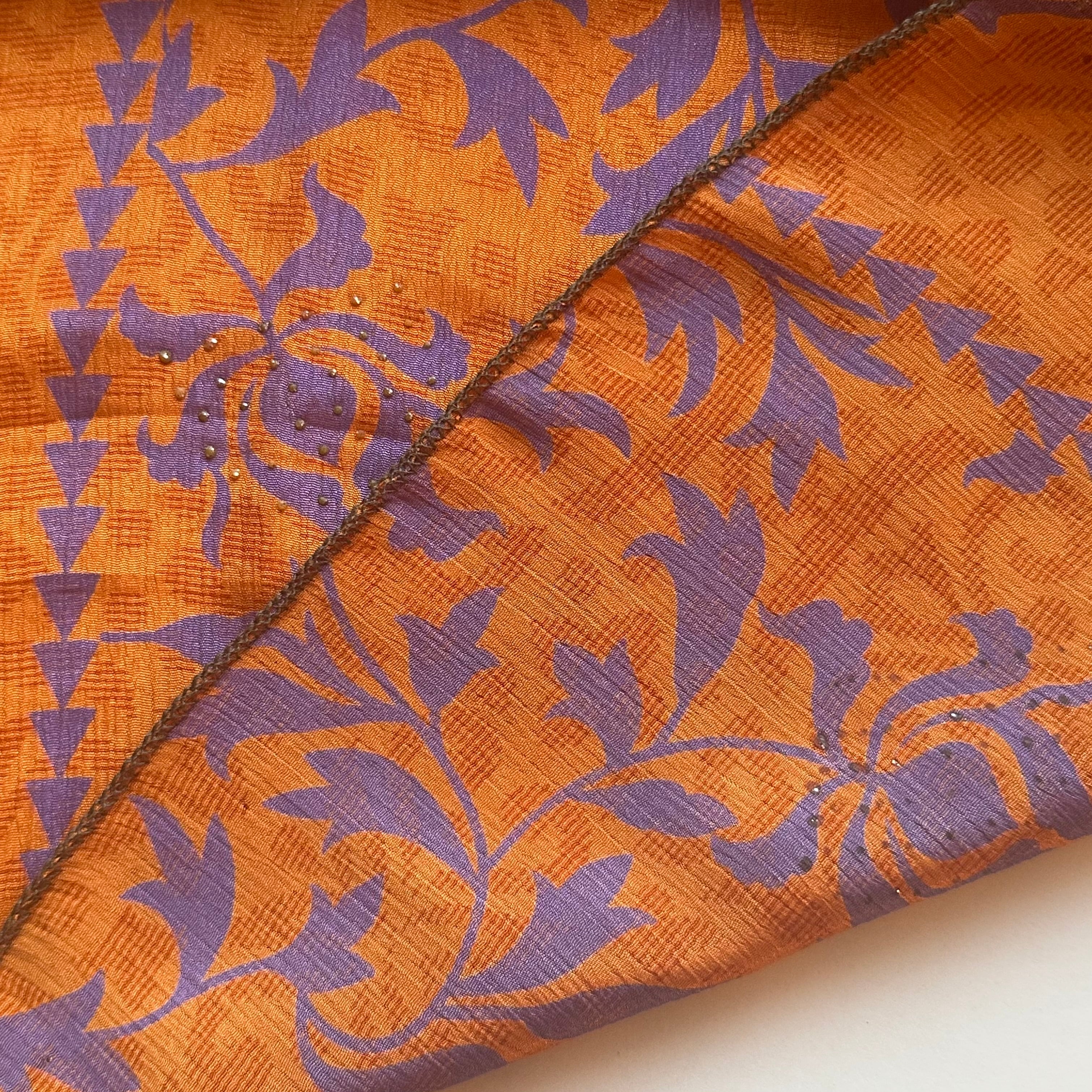 こちらのスカーフは、実際にインドの女性たちにまとわれていたサリーを再利用して仕立てています。