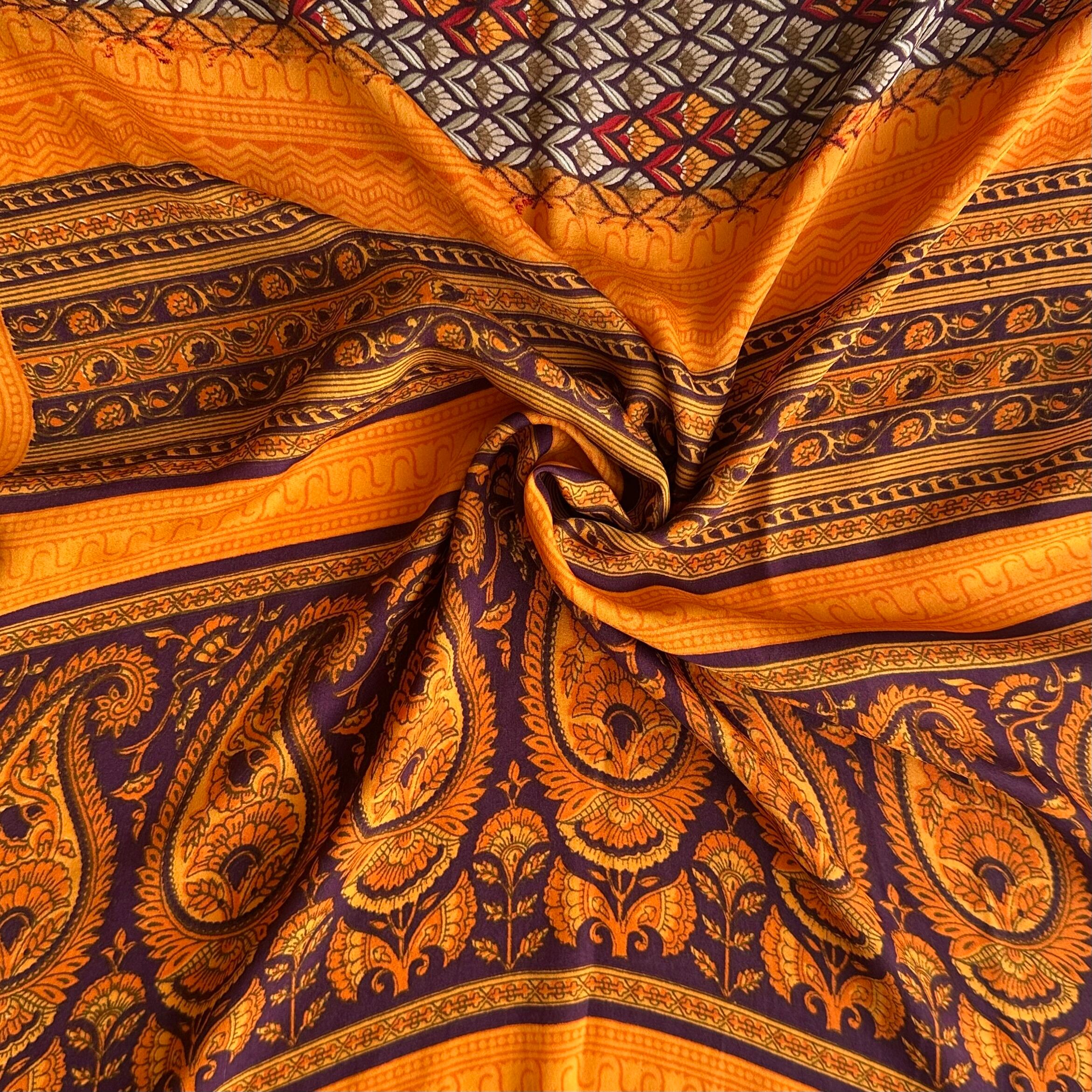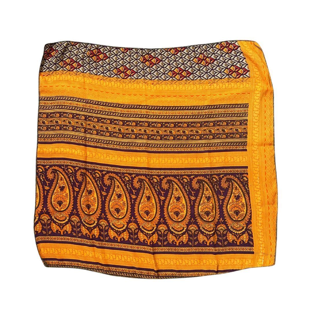 こちらのスカーフは、実際にインドの女性たちにまとわれていたサリーを再利用して仕立てています。
