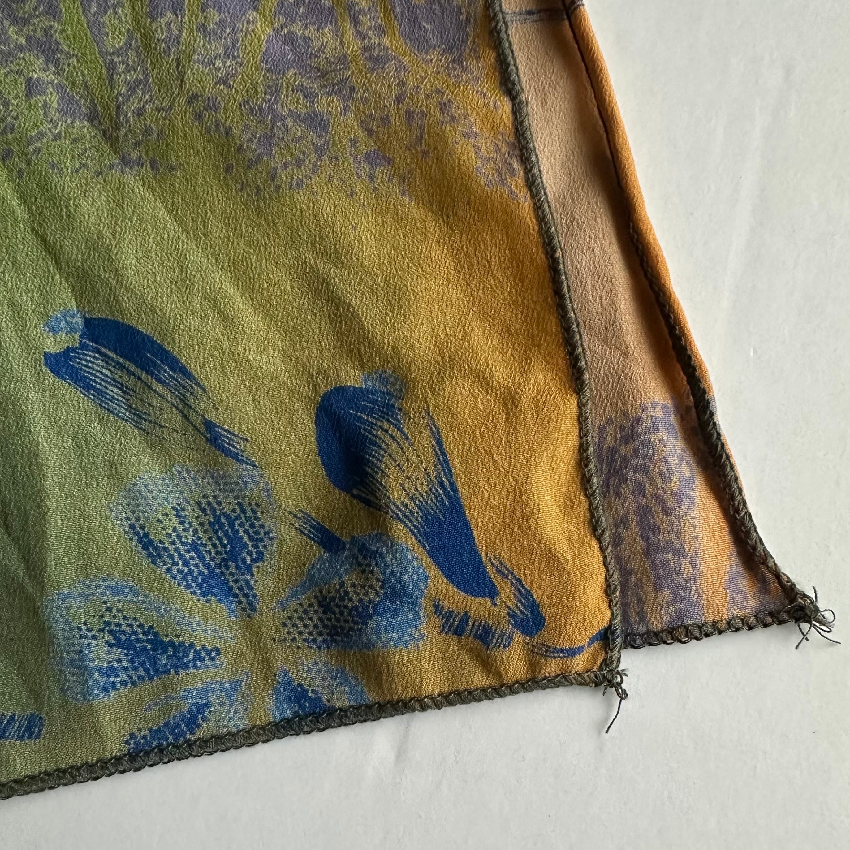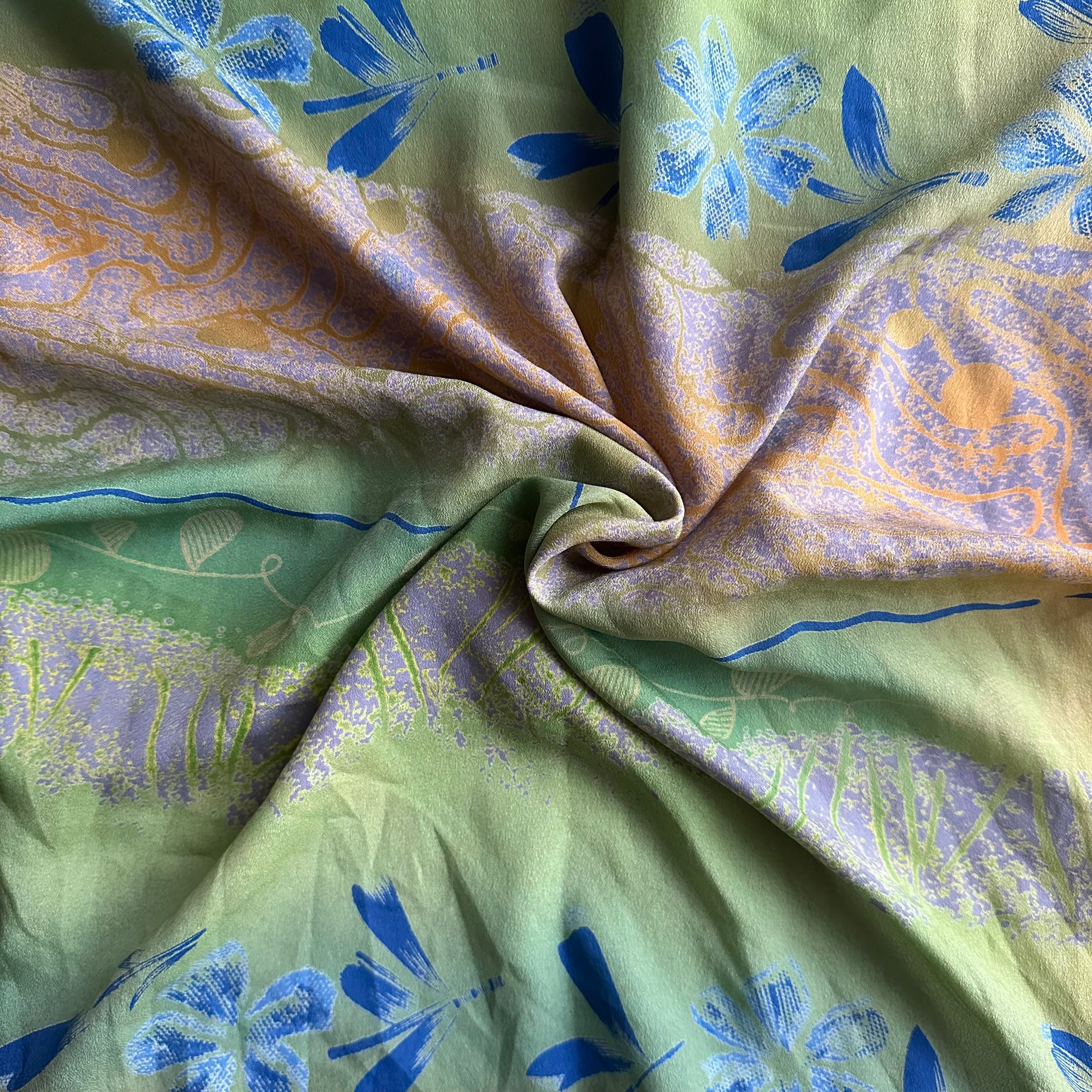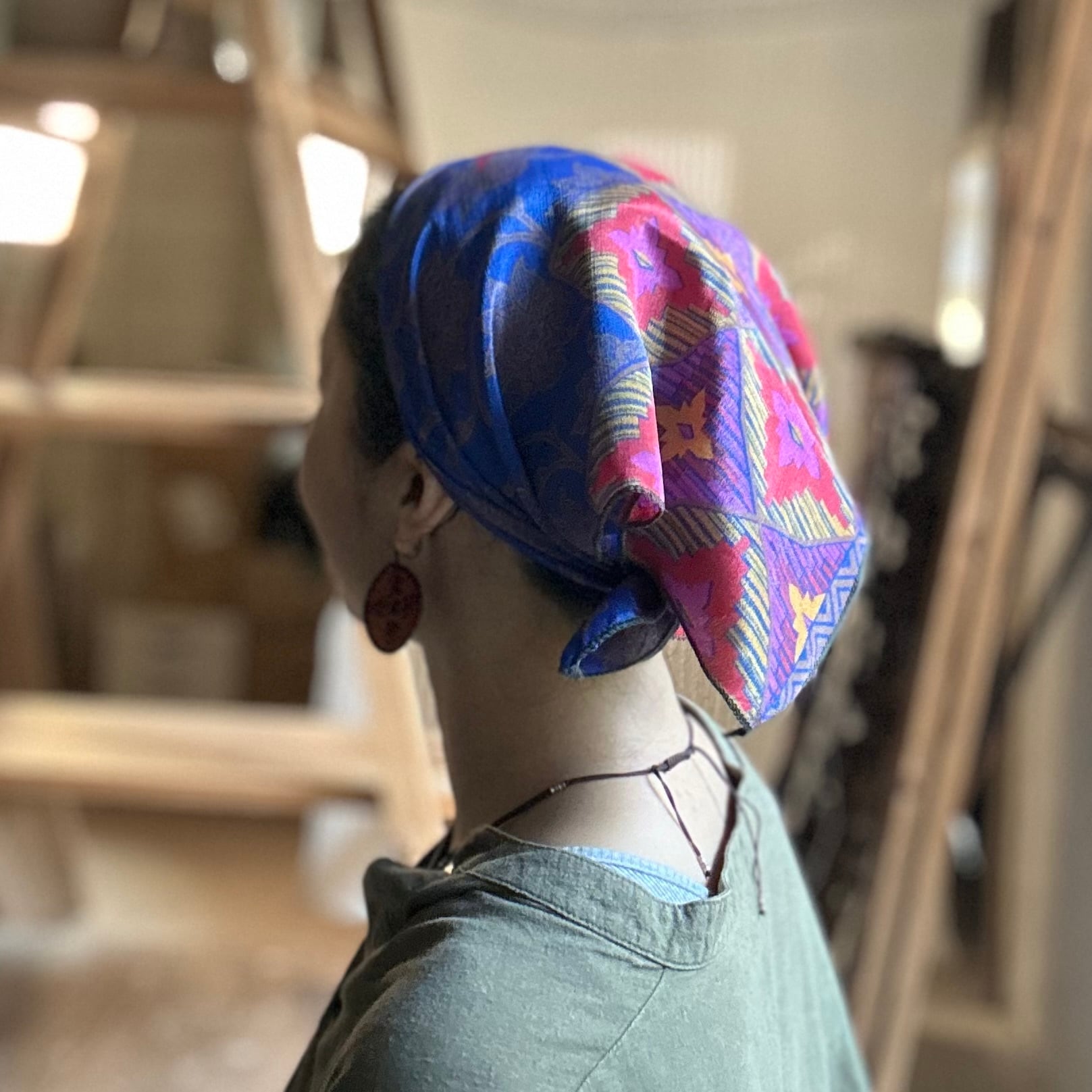 こちらのスカーフは、実際にインドの女性たちにまとわれていたサリーを再利用して仕立てています。