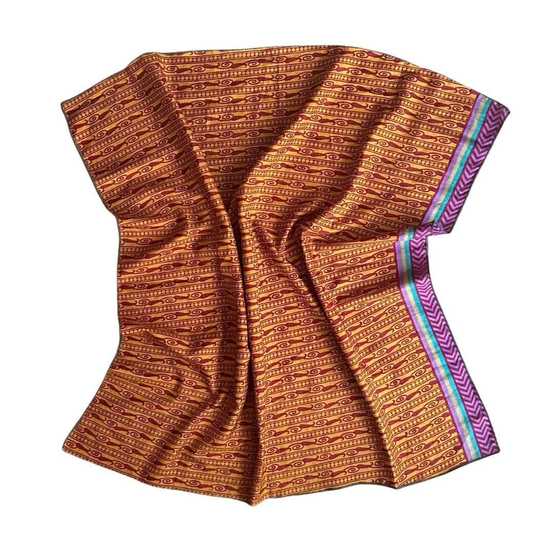 こちらのスカーフは、実際にインドの女性たちにまとわれていたサリーを再利用して仕立てています。