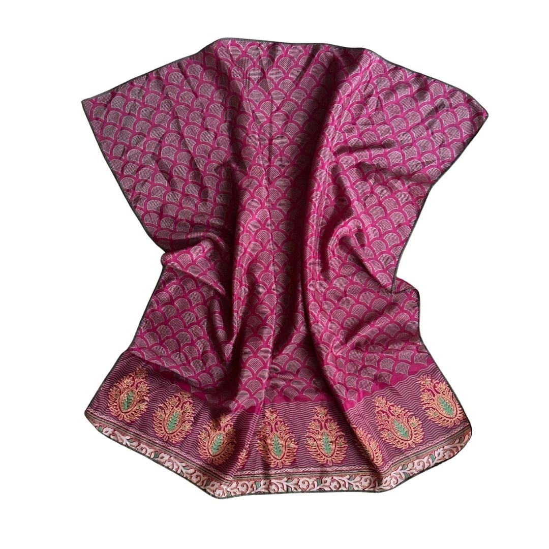 こちらのスカーフは、実際にインドの女性たちにまとわれていたサリーを再利用して仕立てています。