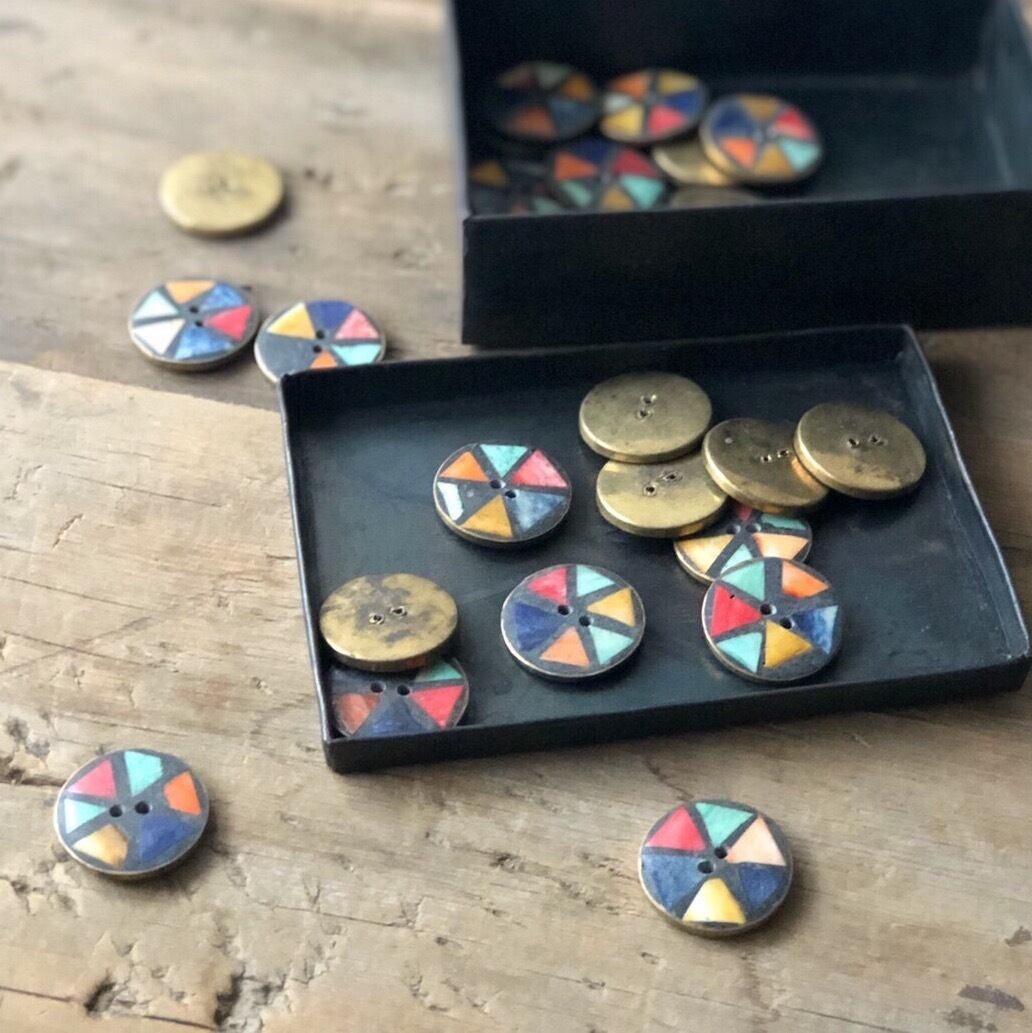 この商品はネコポス¥300で配送可能です。 (ほかの商品と同梱の場合はネコポス配送できない場合もございます。) インドのブラス台のボタンです。 洋服に使っても、アクセサリー等の素材としても使えます。 ※3個セット ※模様やサイズにひとつひとつ個体差がございます。 原産地:インド サイズ:直径約2.7cm、2つ穴 [20190507]