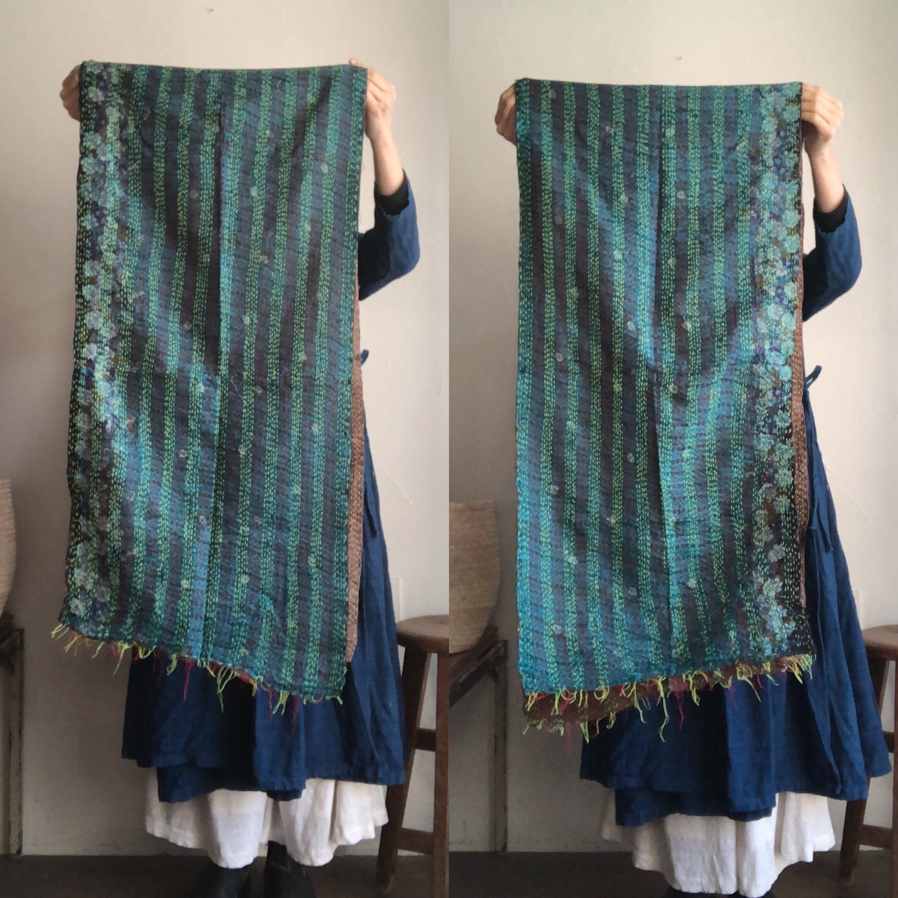 古布を用いたカンタ(刺し子刺繍)のリバーシブルストールです。