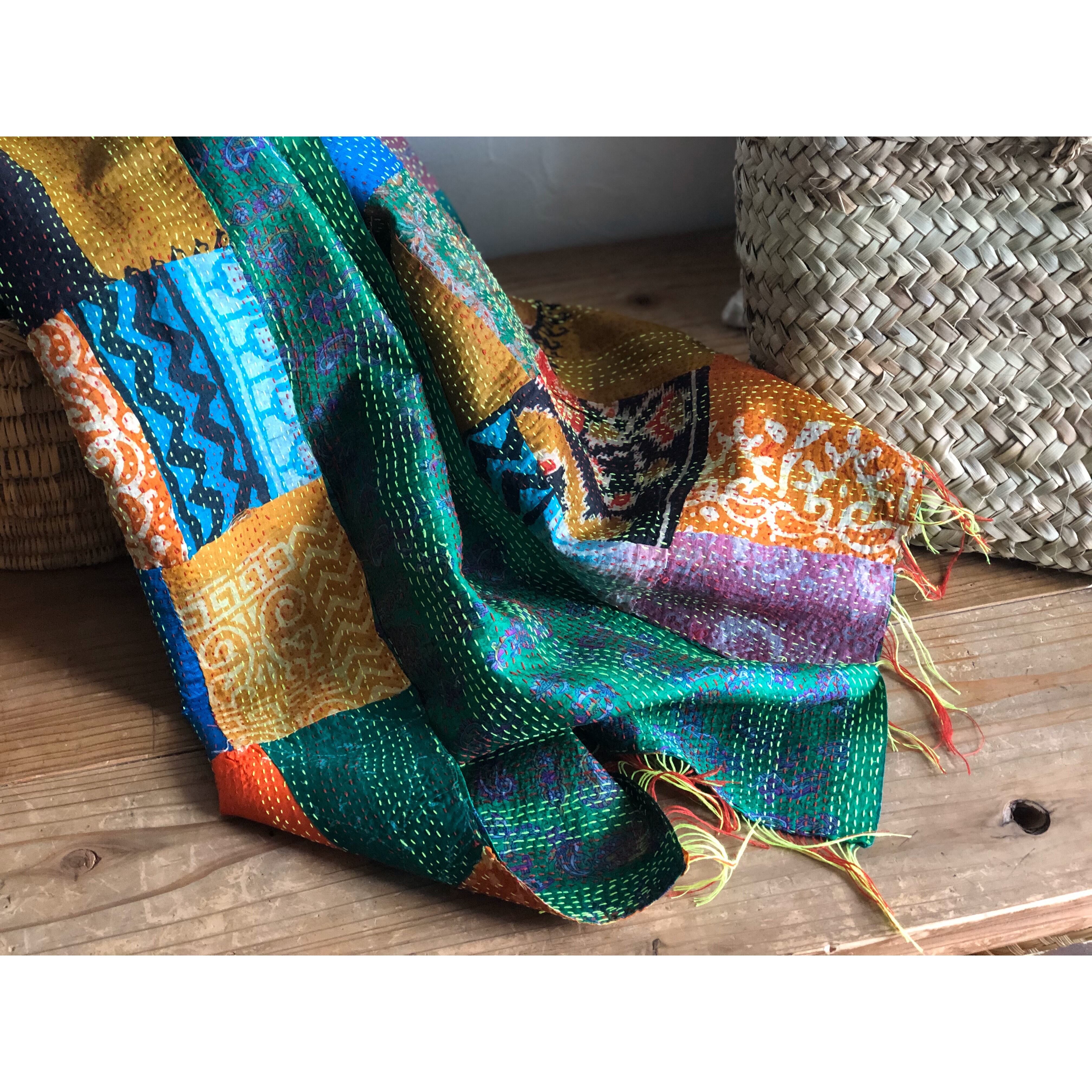 色んな柄がまざりあい、1点もののカンタショールは、着こなしのアクセントに。素朴であたたかいぬくもりが感じられる手仕事の魅力が詰まったアイテムです。