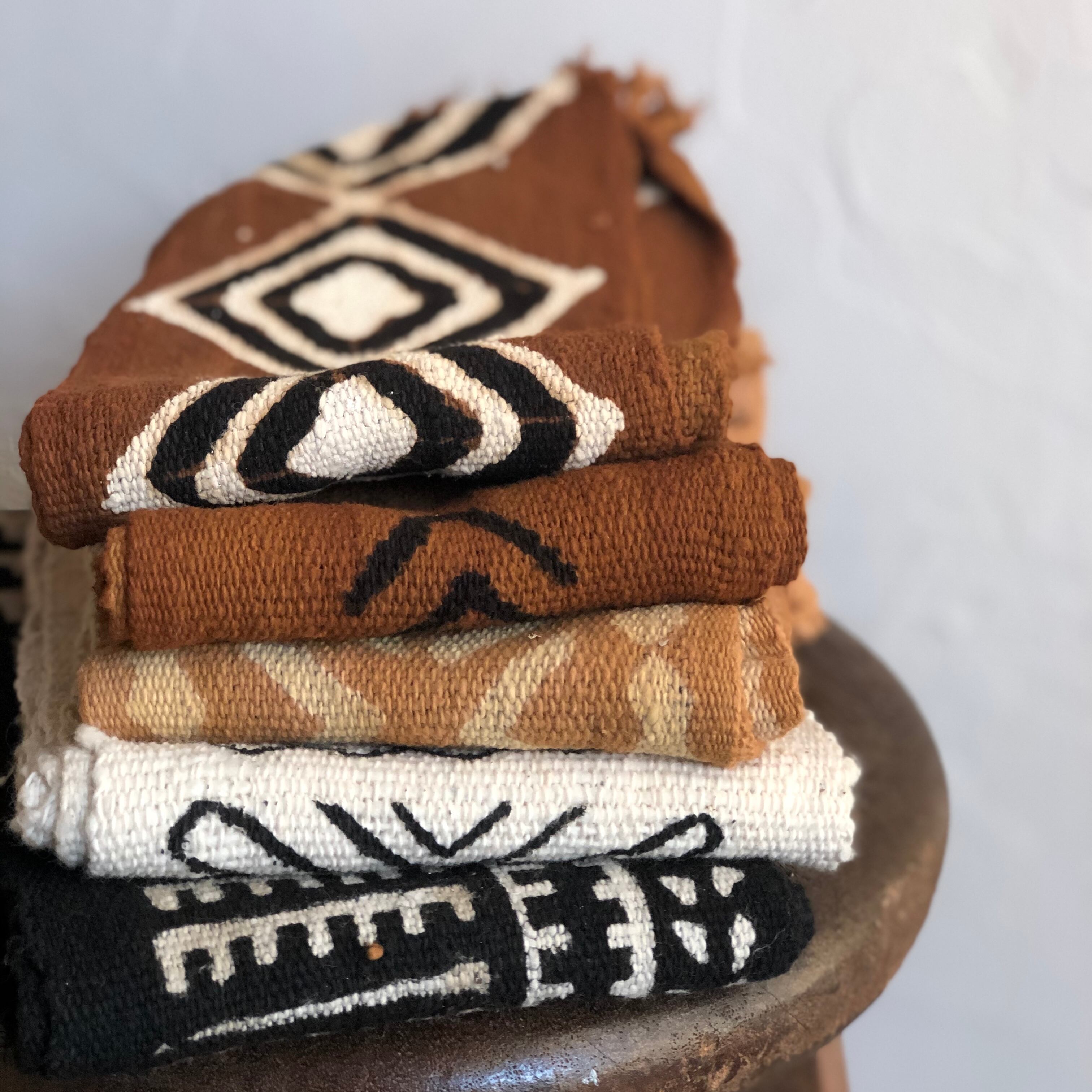 西アフリカに広く見られる水平機によって織られた木綿布を、木の葉などの染料で下染めした後に、川や池から採取して 1 年以上乾燥させた鉄分を含む泥で模様を描きます。