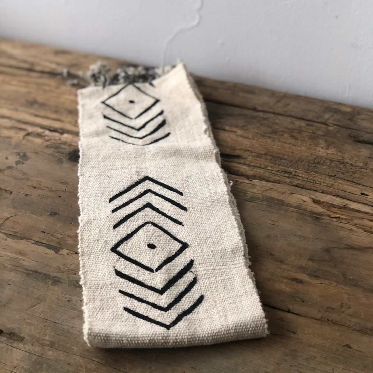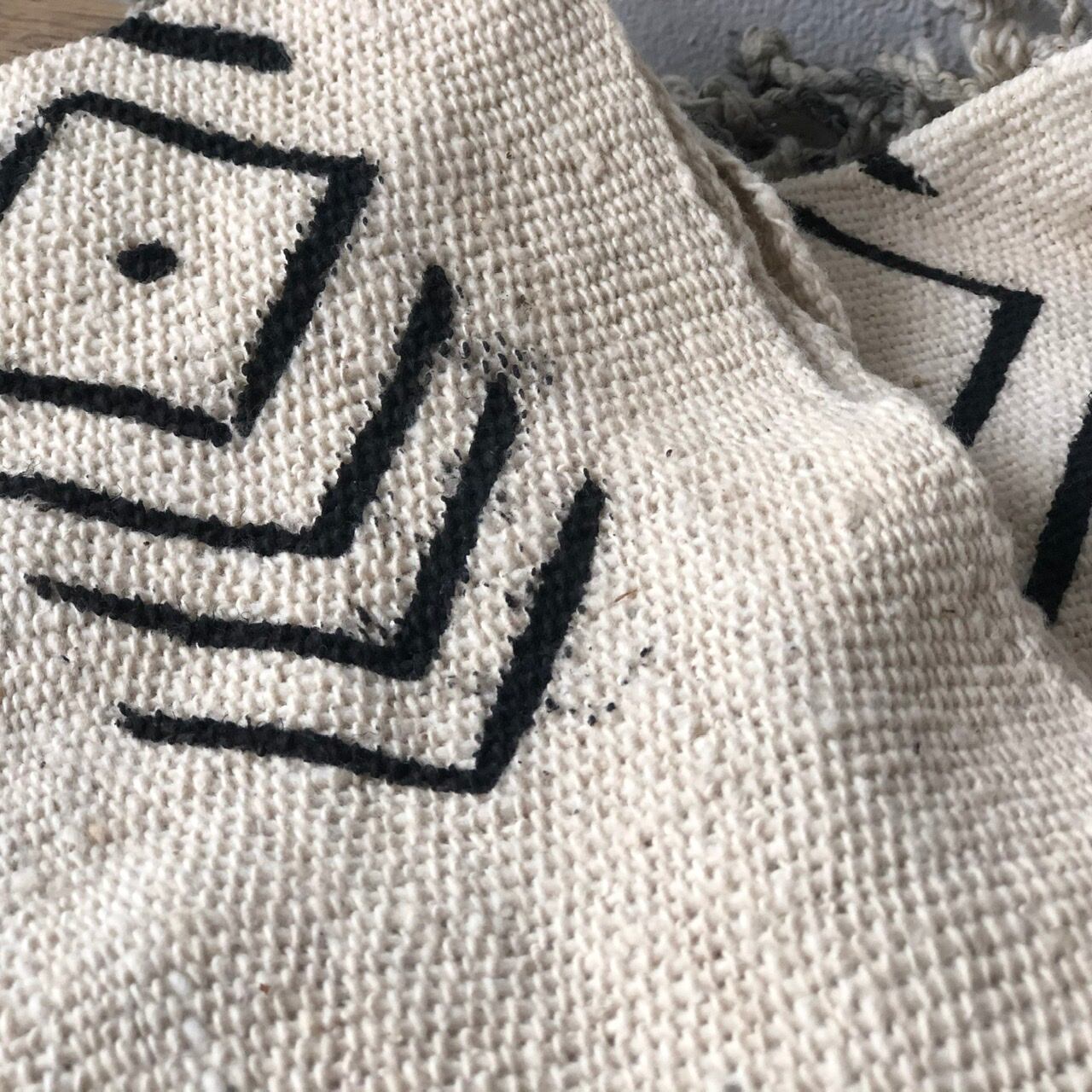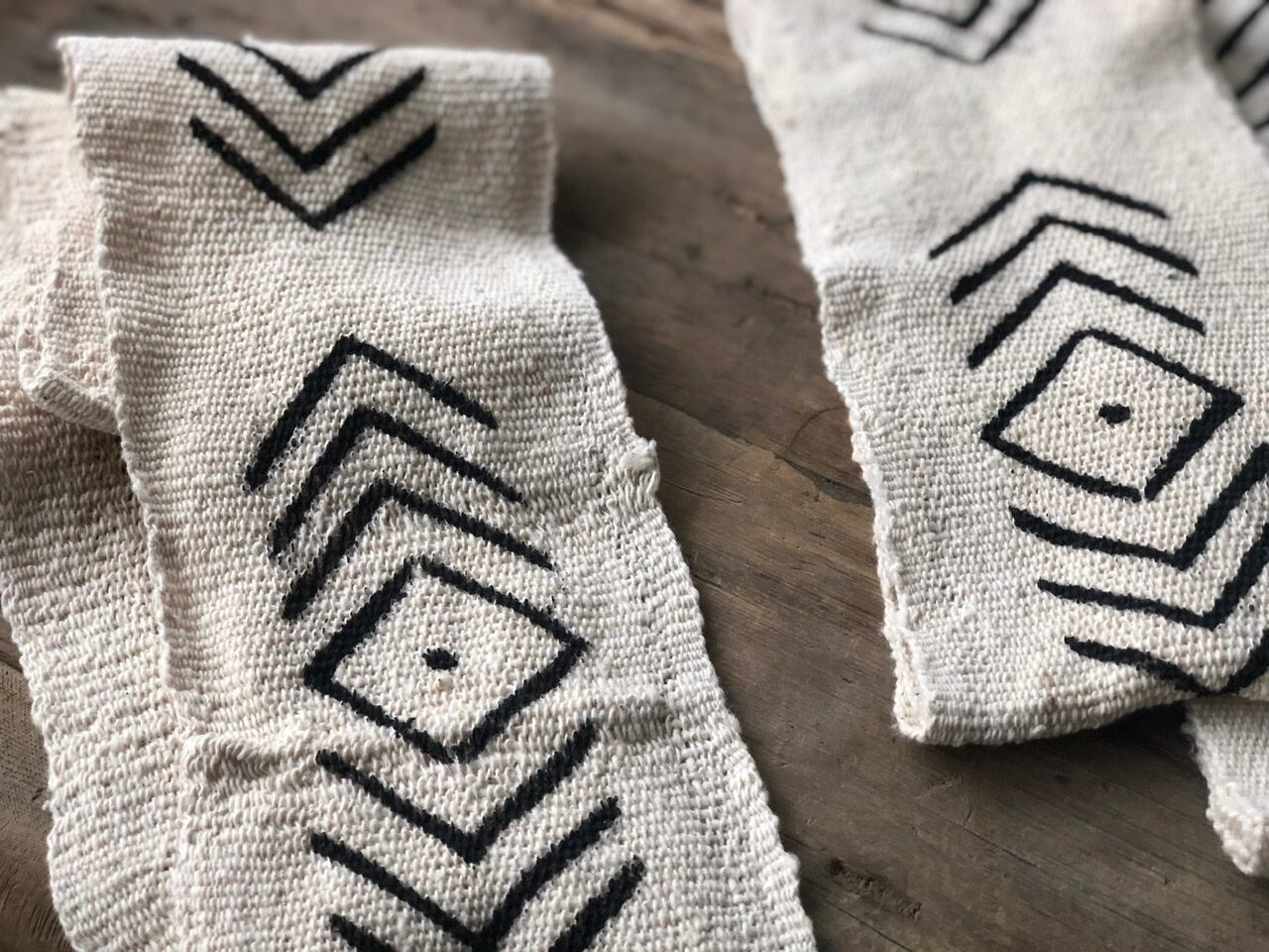 西アフリカに広く見られる水平機によって織られた木綿布を、木の葉などの染料で下染めした後に、川や池から採取して 1 年以上乾燥させた鉄分を含む泥で模様を描きます。