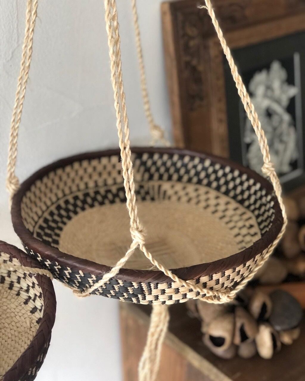 かごや鉢を合わせて吊るすことのできるプランターハンガー。サイズさえ合えば色んな形のかごや鉢を楽しめます。