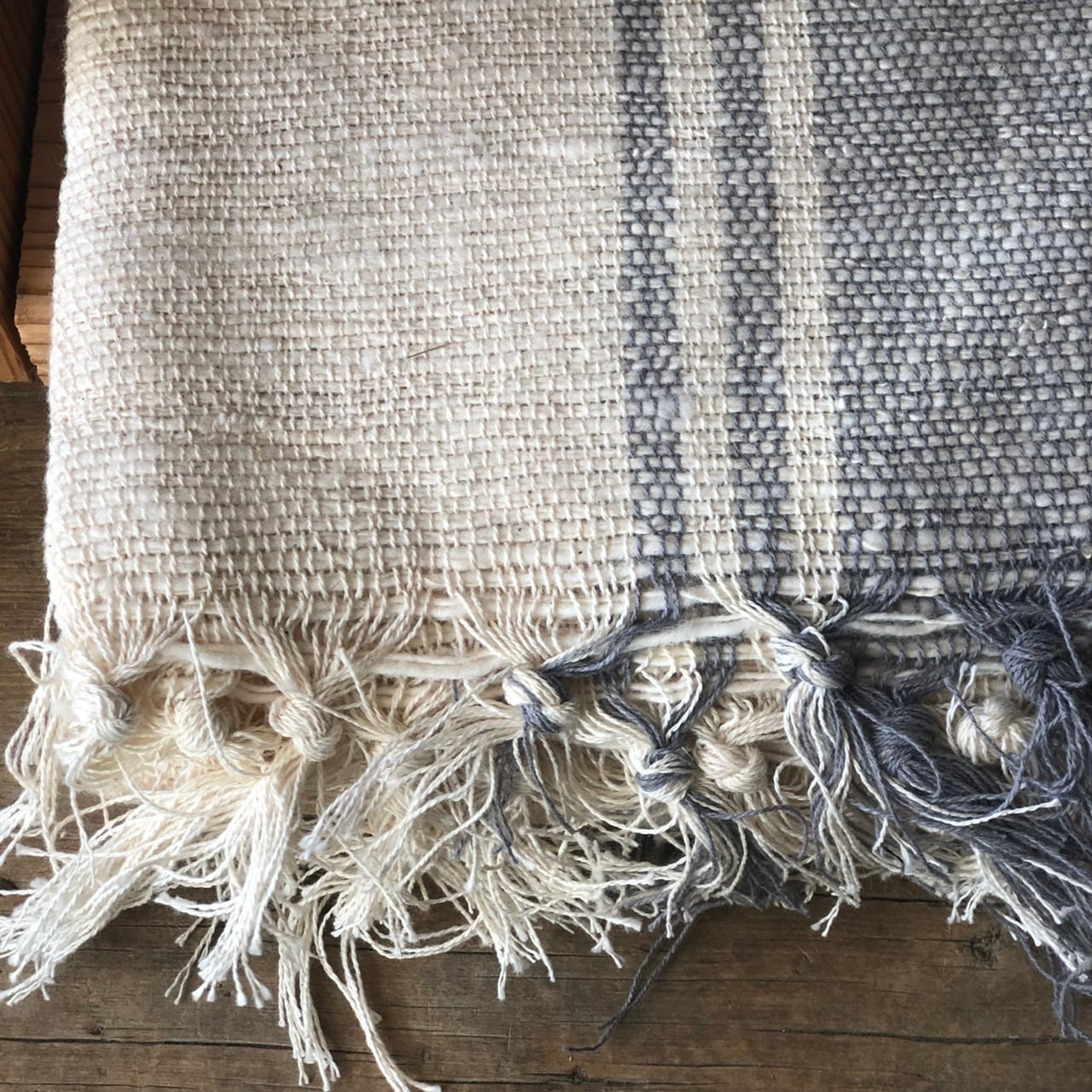 太めでヨリでふんわりした手紡ぎの横糸と、機械紡ぎのしっかりした印象の縦糸で織られていて、その風合いを充分に味わえる 一枚。