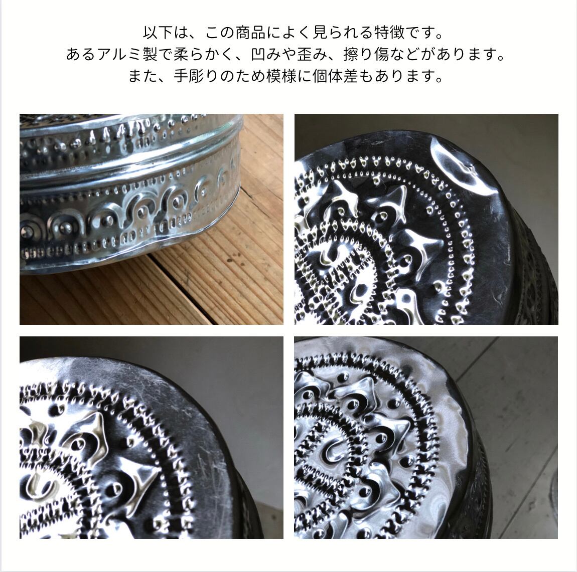 レトロな菓子箱のようなアルミの箱。バリの職人さんが一点一点、コンコンと叩いてつけられた模様が、側面と底面に入っていてとってもきれいです。エンボス模様が複雑に光を反射して、お部屋の雰囲気をパッと明るくしてくれます。
