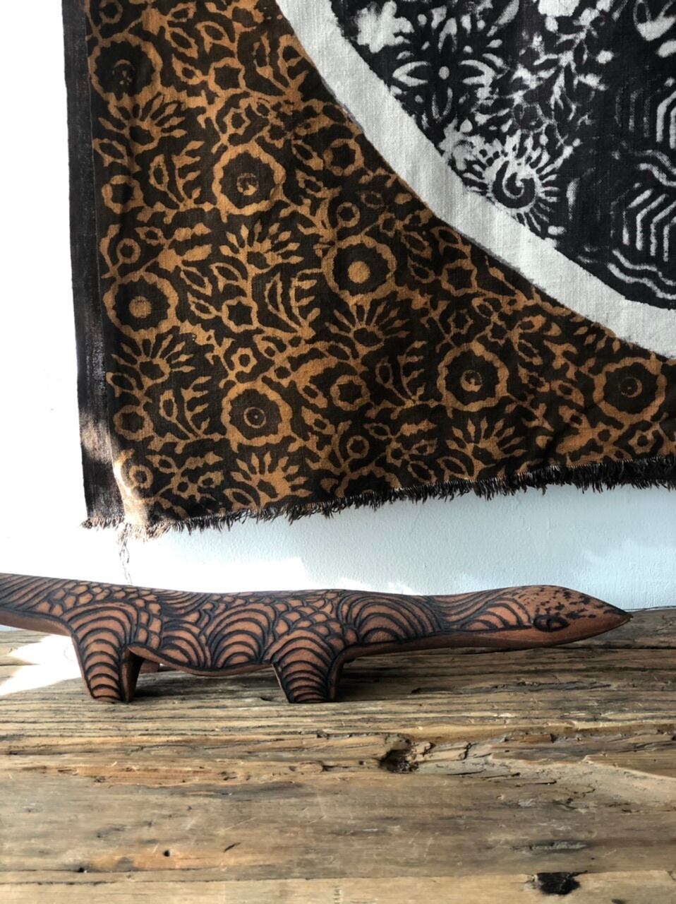 職人さんの手で彫られた木版を使って、ハンドプリントで作られています。色により違う木版を使い、色の数だけ重ねてゆきます。版と版のつながりに、ズレや重なりが生じますが、ブロックプリントの特徴であり、魅力でもあります。