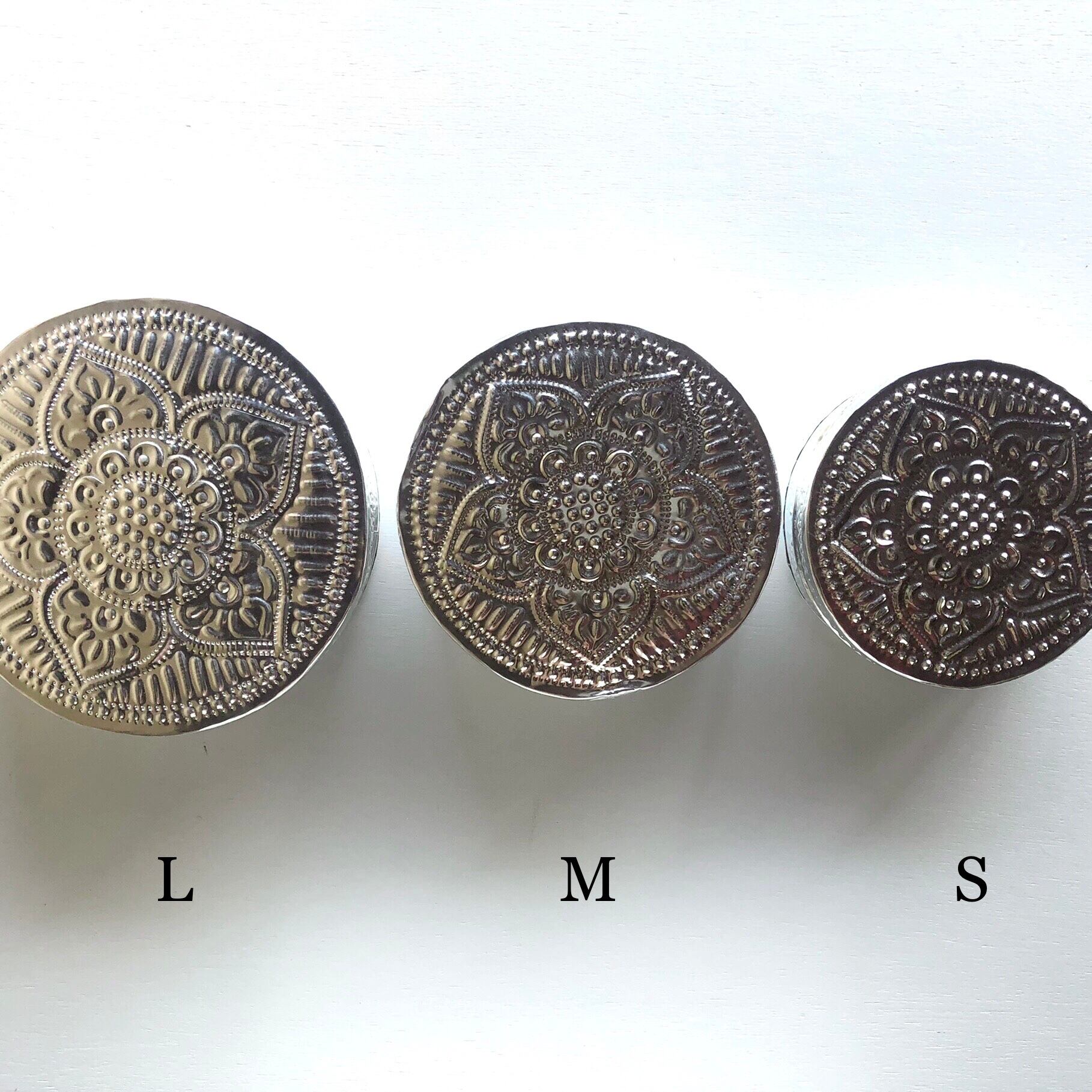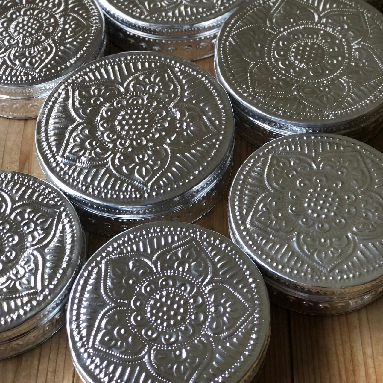 レトロな菓子箱のようなアルミの箱。バリの職人さんが一点一点、コンコンと叩いてつけられた模様が、側面と底面に入っていてとってもきれいです。エンボス模様が複雑に光を反射して、お部屋の雰囲気をパッと明るくしてくれます。