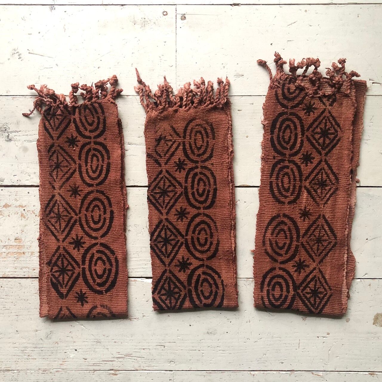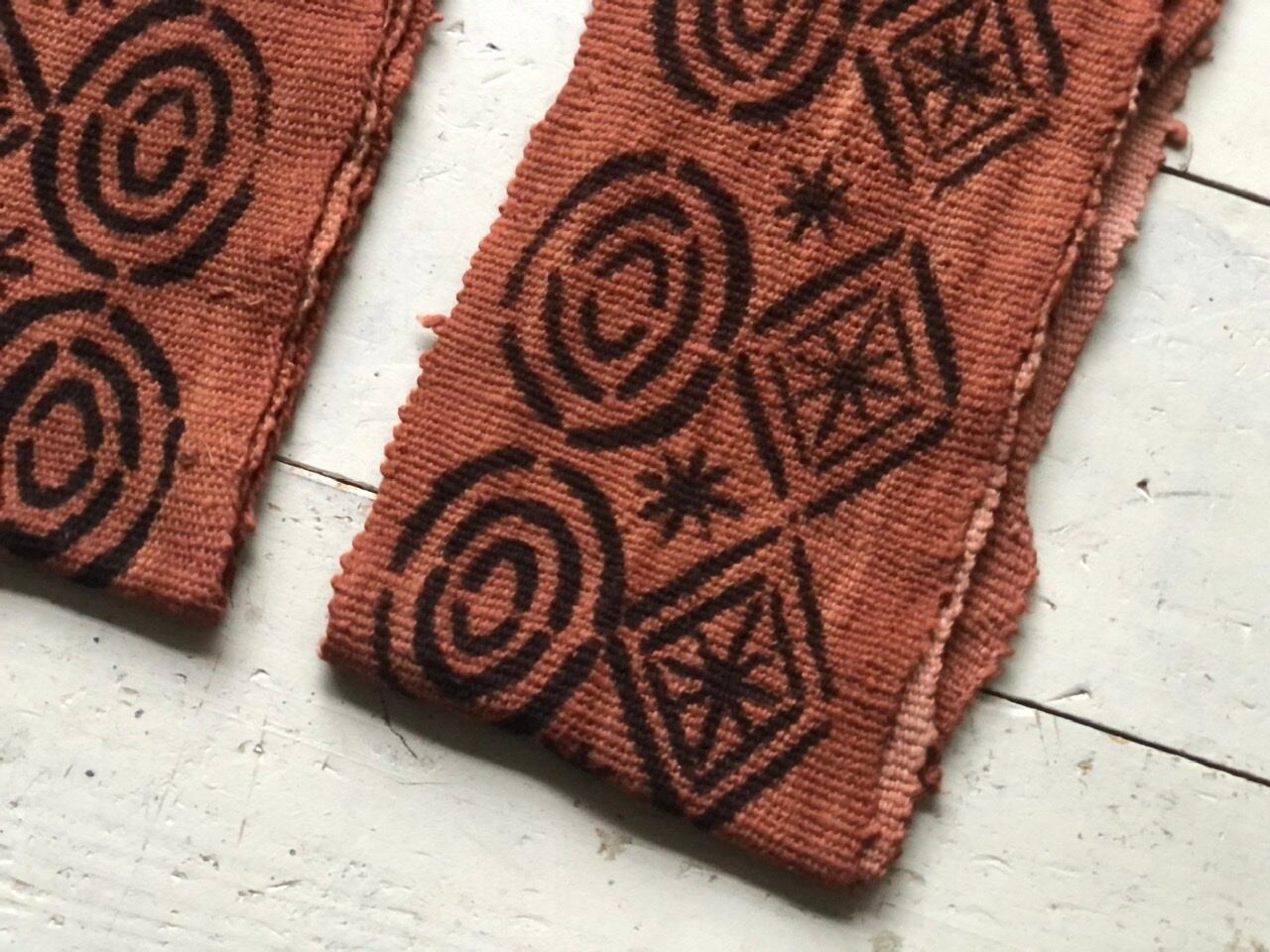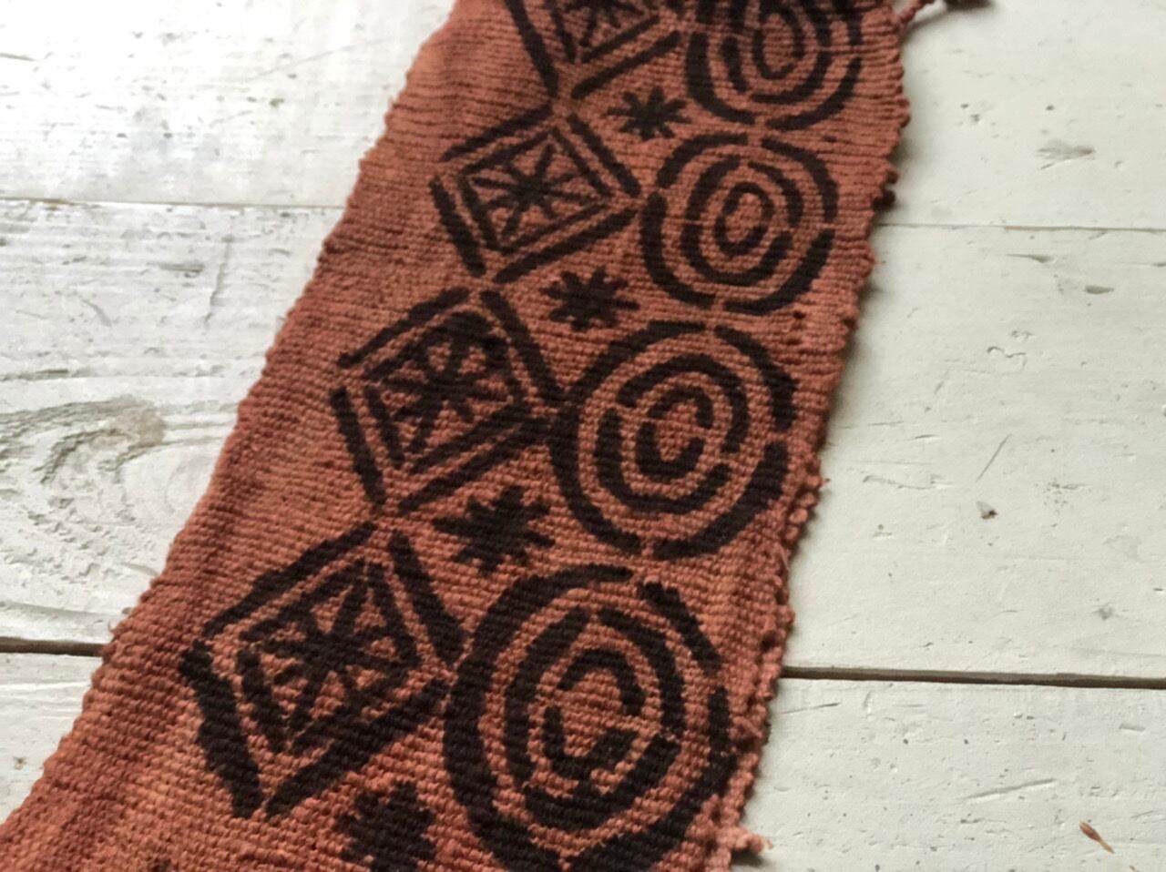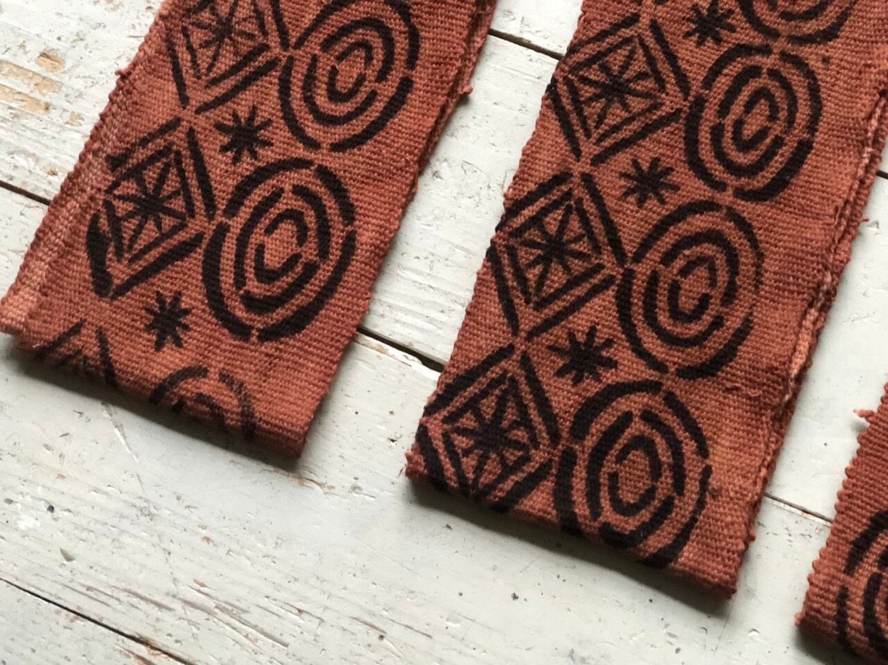西アフリカに広く見られる水平機によって織られた木綿布を、木の葉などの染料で下染めした後に、川や池から採取して 1 年以上乾燥させた鉄分を含む泥で模様を描きます。