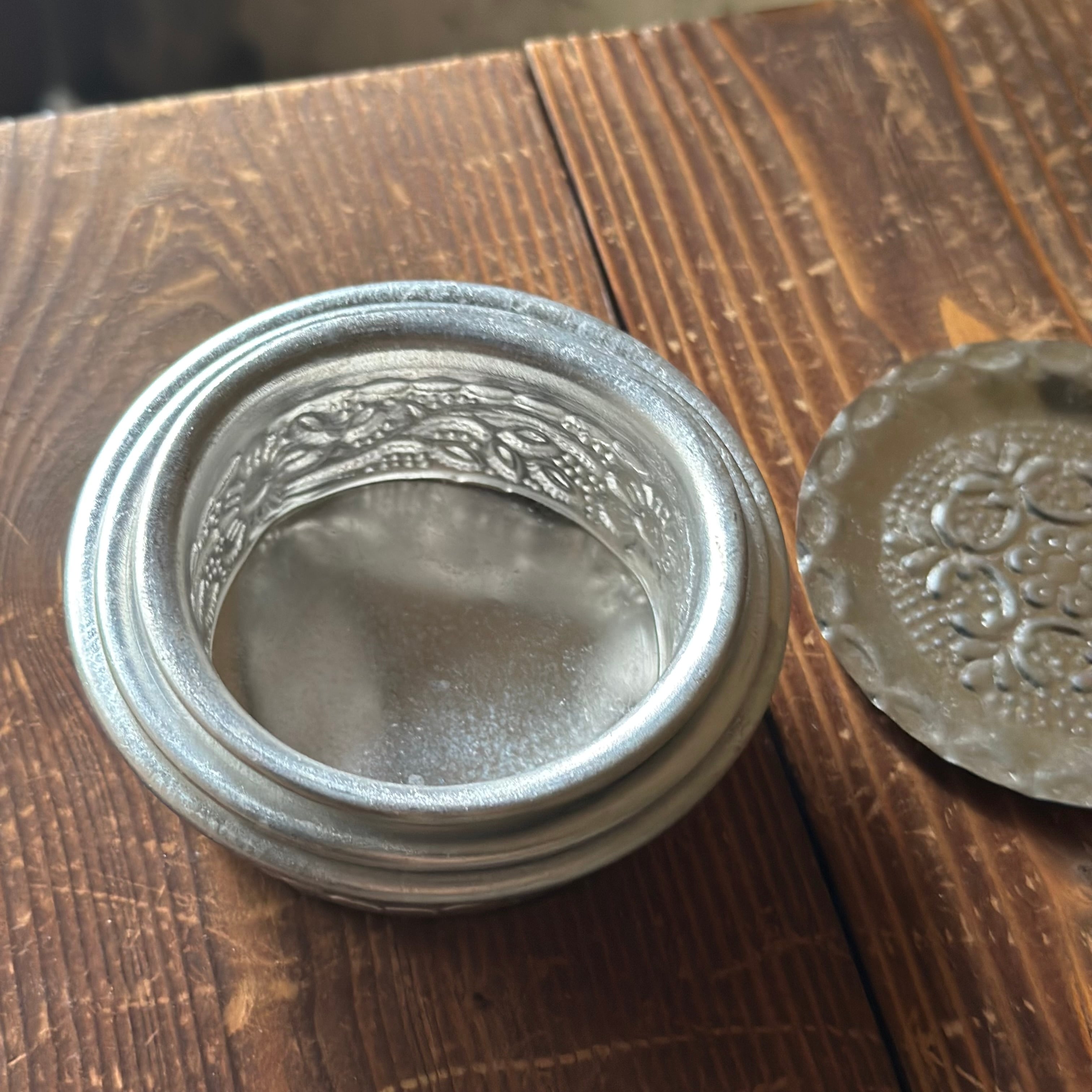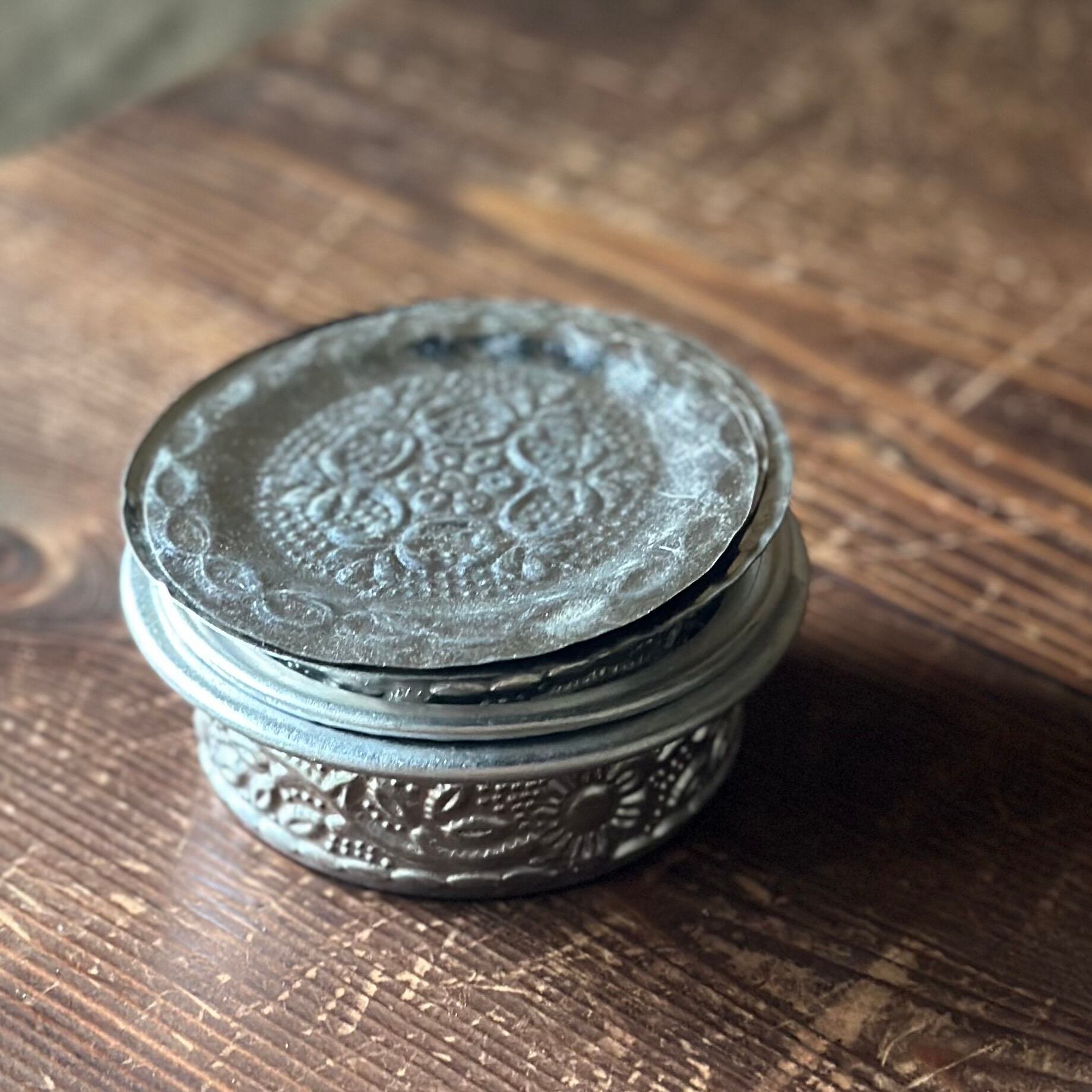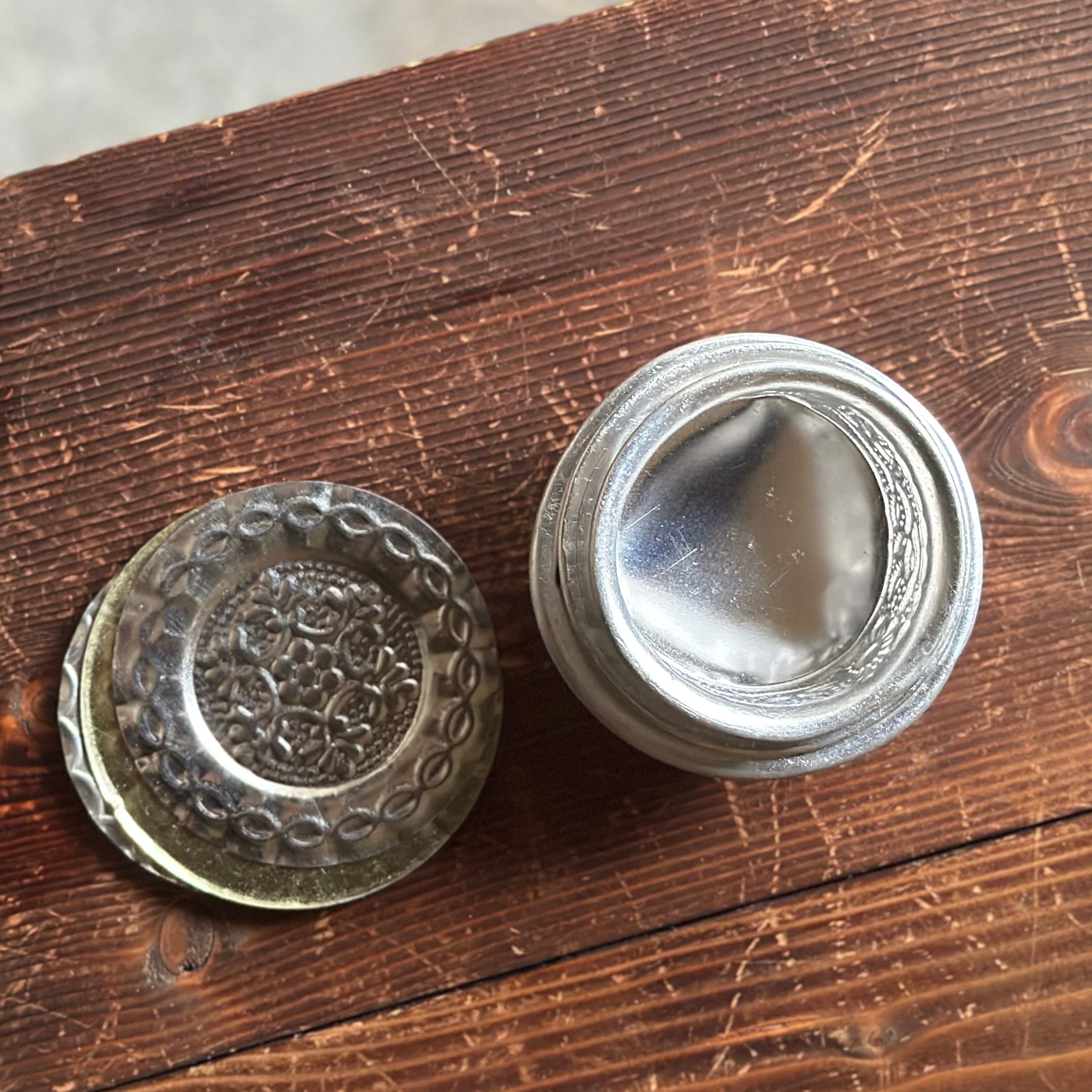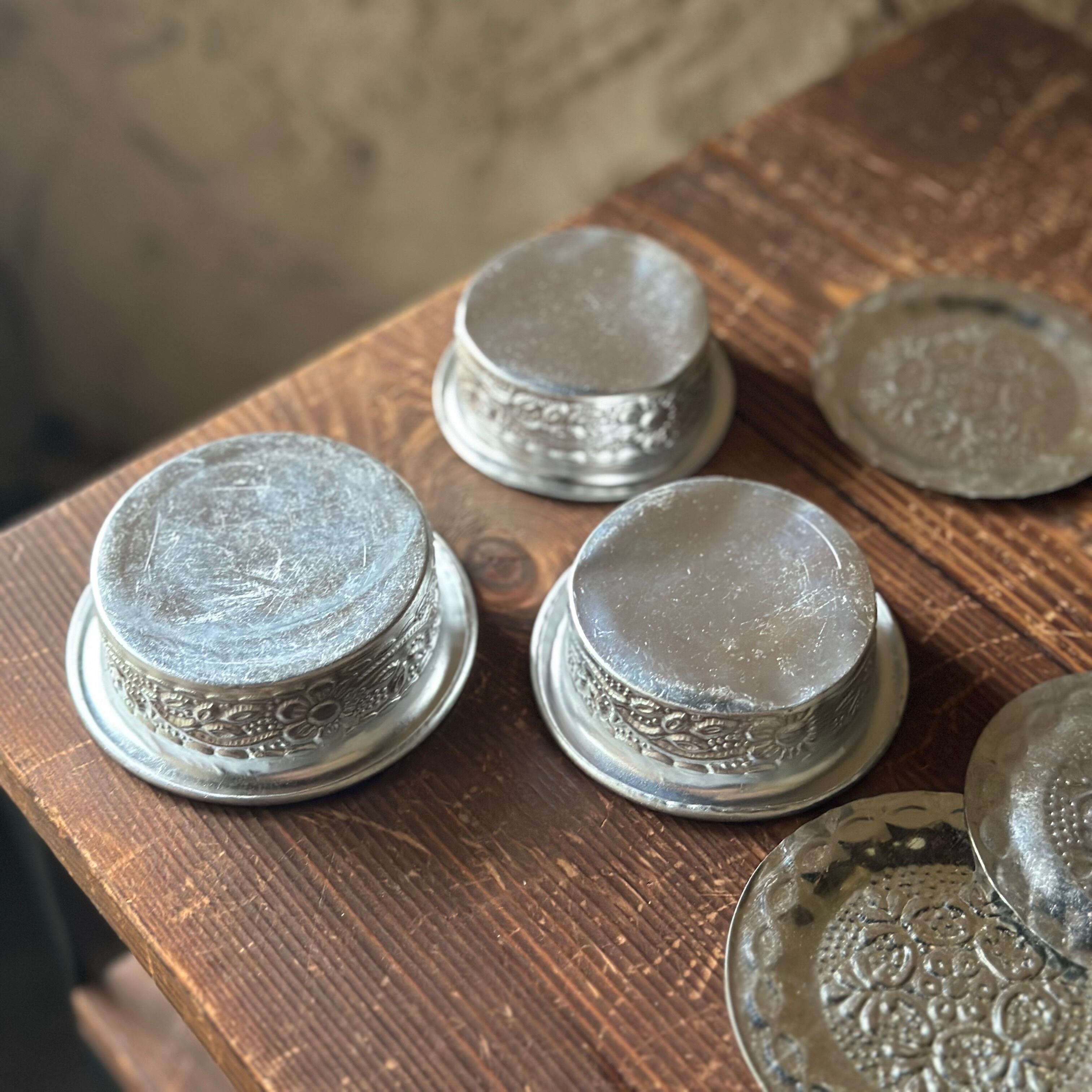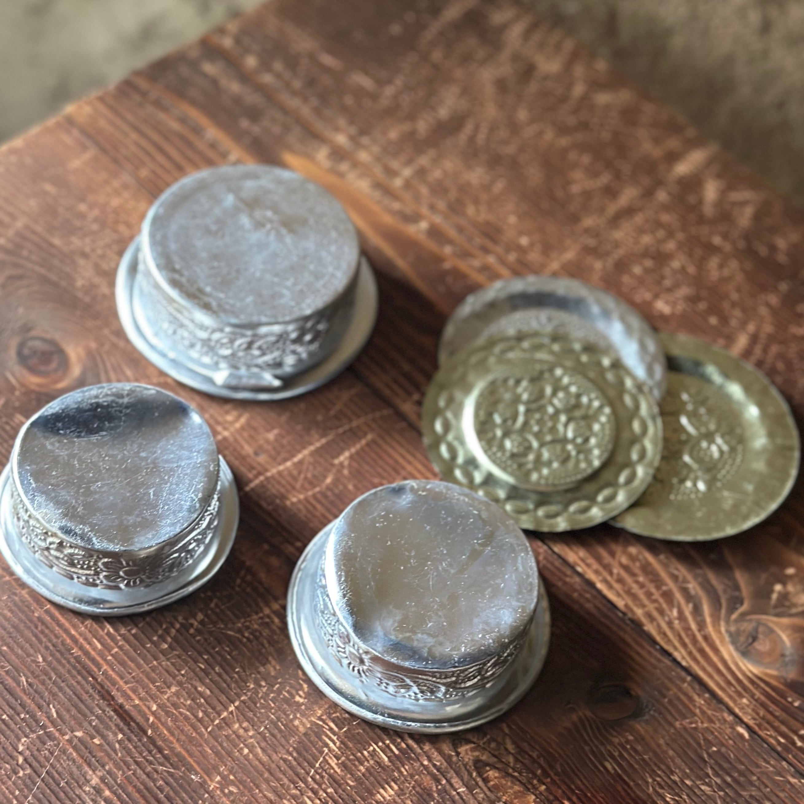 インドならではの美しい装飾のアルミの蓋付きカップ。蓋はソーサーにもなり、いろんな使い方ができそうです。